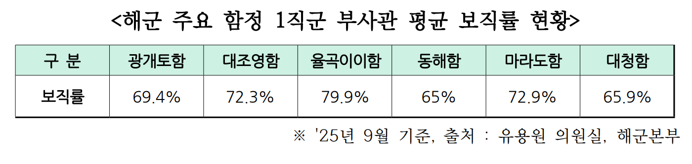 韩国国民力量议员柳宗元表示,“韩国海军自身努力已到极限,需要全政府的关注和支持”,根据其获得的韩国海军总部提交的《主要舰艇干部职位分配情况》资料,韩国海军下士职位的分配率异常低,对于韩国海军的下士职位空缺,柳宗元议员指出,“下士的空缺目前由中士、上士等高级士官填补,但如果不尽快解决这个问题,海军将面临难以维持适当数量的熟练士官的困境。”他还提到,“下士在长期航行和艰苦的工作环境下,越来越不愿意从事海舰工作。因此,尽快引入创新的上船激励制度、改善士官待遇,已成为亟待解决的问题。”