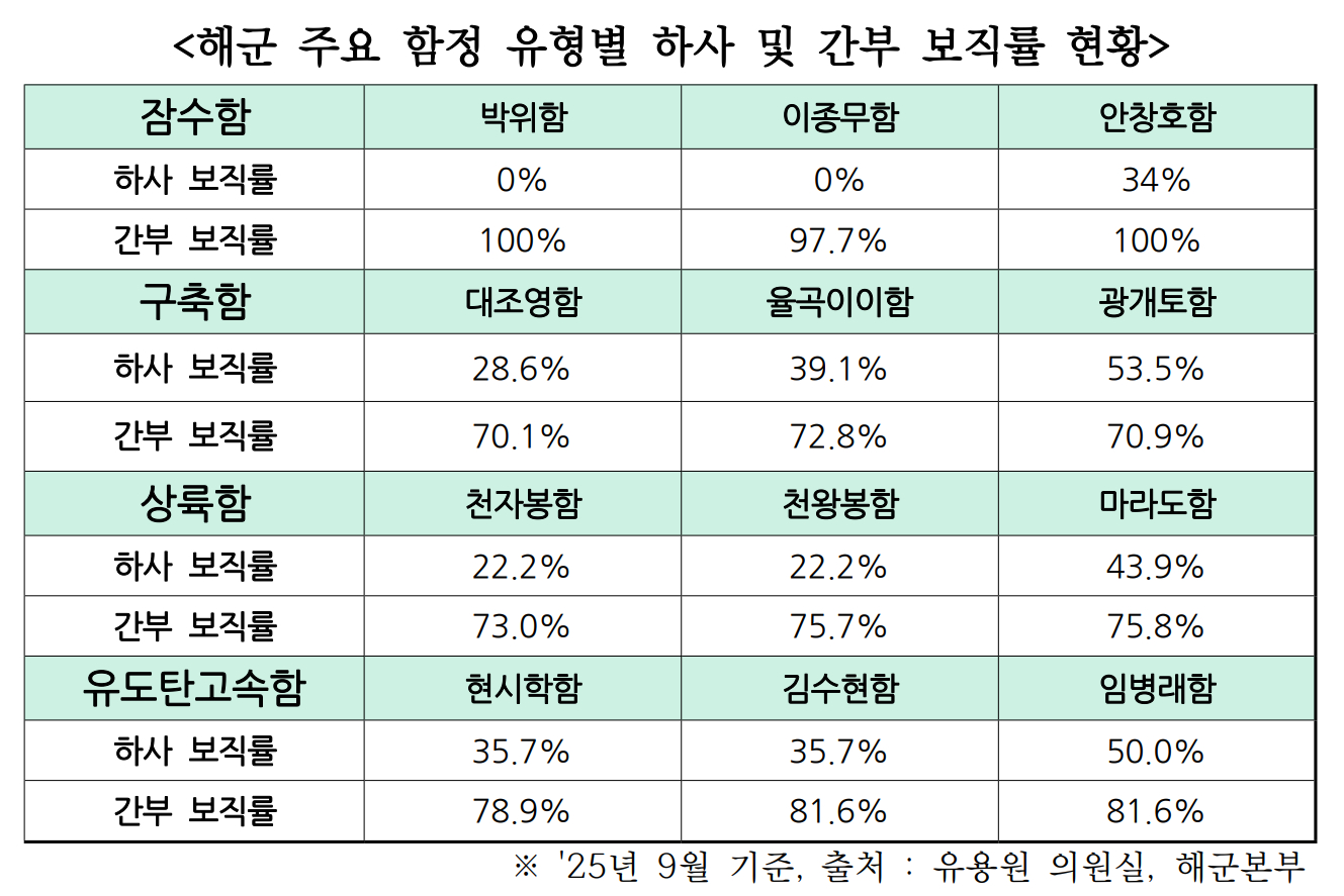此外,用于西海北方界线(NLL)等沿海防御和高速机动任务的主要导弹高速舰,下士职位分配率也均低于50%。例如,“玄时学号”和“金秀炫号”分别为35.7%,而“林炳来号”也仅为50%,显示出这些舰艇上仅有不到一半的下士在服役。