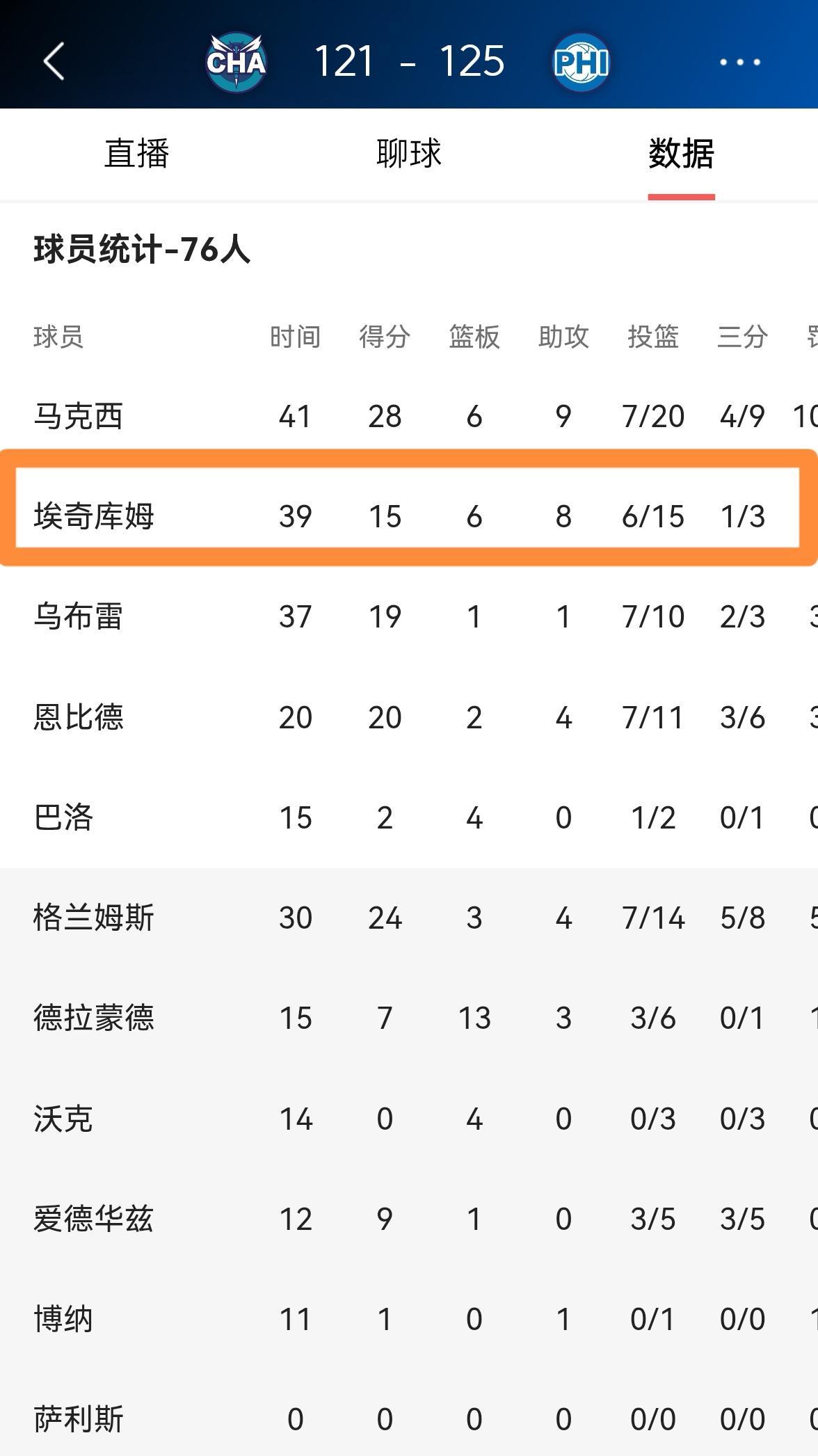 76人超级新秀埃奇库姆真是天赋异禀!在今天76人主场以125:121险胜黄蜂的比