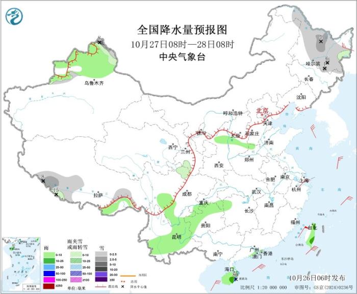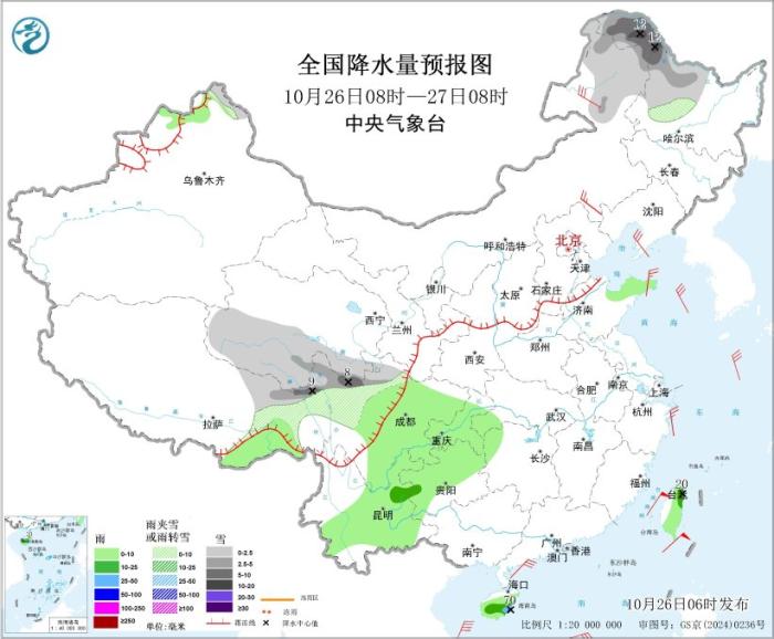 10月26日08时至27日08时,内蒙古东北部、黑龙江西北部、青海南部、西藏东北部、川西高原北部等地有小到中雪或雨夹雪,其中,黑龙江西北部、青海东南部、西藏东北部等地部分地区有大到暴雪(10~12毫米)。西藏东南部、四川大部、重庆大部、湖北西南部、湖南西北部、贵州中北部、云南中东部、海南岛大部、台湾岛大部等地部分地区有小到中雨,其中,海南岛东南部局地有大到暴雨(50~70毫米)。内蒙古中东部、华北北部、辽东半岛、山东半岛等地部分地区有4~6级风、阵风7-8级;东海南部、台湾海峡、南海西北部海域将有5~7级、阵风8级的偏北到东北风。