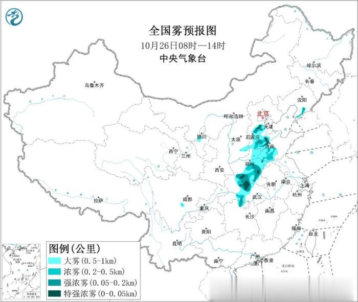 10月26日早晨至上午,河北中南部、山东西部、河南中东部、湖北中部等地有大雾,其中河北南部、山东西部、河南南部、湖北北部等地的部分地区有能见度不足500米的浓雾,局地有能见度不足200米的强浓雾。中央气象台10月26日06时继续发布大雾黄色预警。26日上午起,受冷空气影响,华北中南部、黄淮中西部等地的大气扩散条件逐渐好转,霾天气减弱消散。