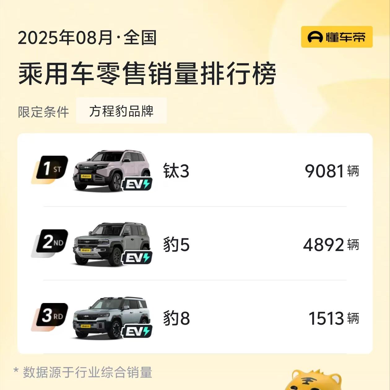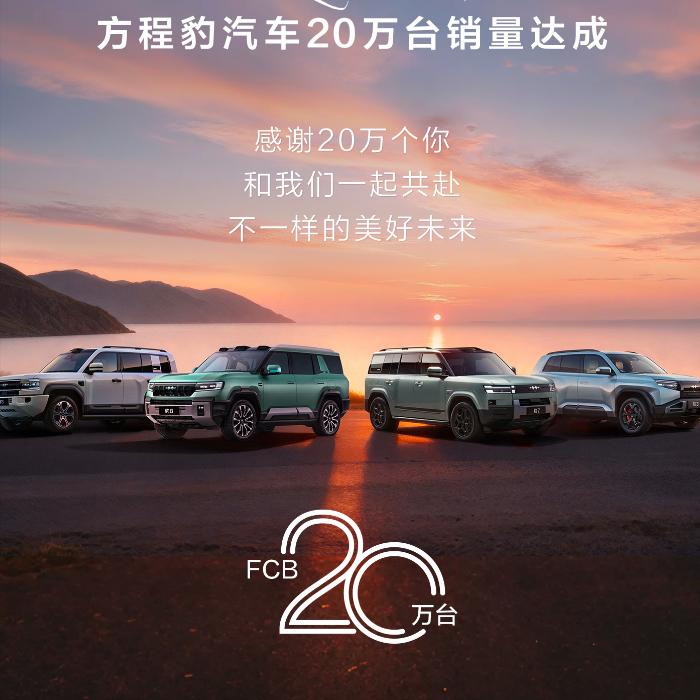 均价23.88万,卖了20万台,比亚迪方程豹这个速度,竞品很难受吧! 刚刚,方程豹汽车宣布,20万台销量达成,成交均价23.88万! 在懂车帝可以看到,九月份方程豹卖了22749台,钛3和钛7都超8千台,10月份应该能冲3万台。 一个2年多的新品牌,方程豹这个成绩怎么样?