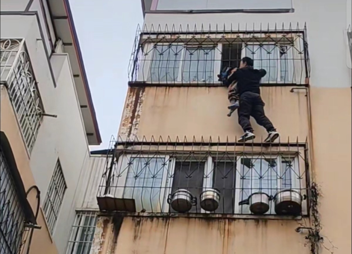 就在这千钧一发之际,身着京东秒送的外卖小哥骑着电动车路过小区。听到呼救声,他快步冲进现场。看清险情后,他仰头观察防护窗结构,随即双手抓住一楼栏杆,脚蹬墙面,开始徒手向上攀爬。