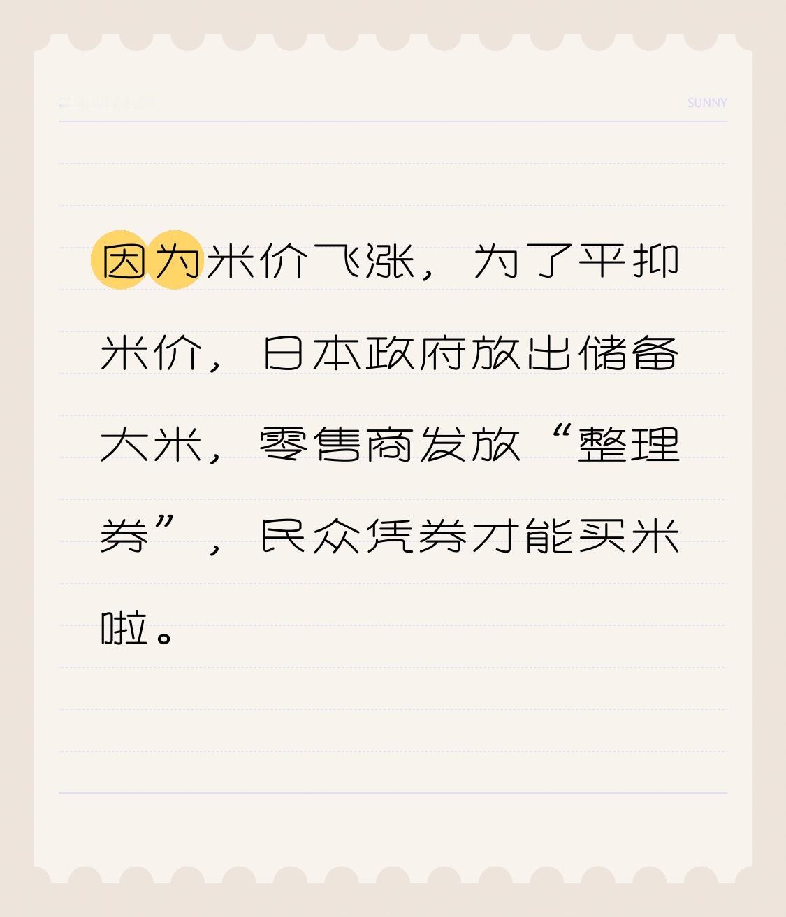 因为米价飞涨,为了平抑米价,政府放出储备大米,零售商发放“整理券”,民众凭券才能买米啦。 5月31日储备米上架,很多地方都得先领券再换米,像仙台、横浜、东京新宿等地的超市都在发券卖米。还有大阪府给儿童、孕妇等发数字粮票买米,面额都涨到7000日元了。 这一幕幕真让人感觉日本仿佛回到了以前的“粮票时代”,只能说世事难料啊。日本粮票 米价飞涨 储备大米日本米价格暴涨 日本粮食价格 日本大米大涨价 日本米价格 日本米价危机 日本米价风波 日本产米