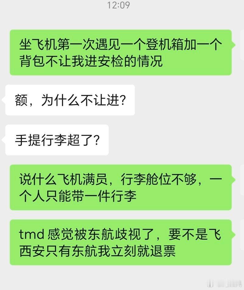 第一我理解客舱行李舱紧张的情况,接受放座位或直接让我放行李箱,但不让我安检太扯了。第二东航的执行标准和订票要求不统一,还涉嫌歧视旅客,我会接着投诉。第三行李贴的标签我已经撕了,谢谢施舍给我的服务,待会儿不让我登机我就退票。