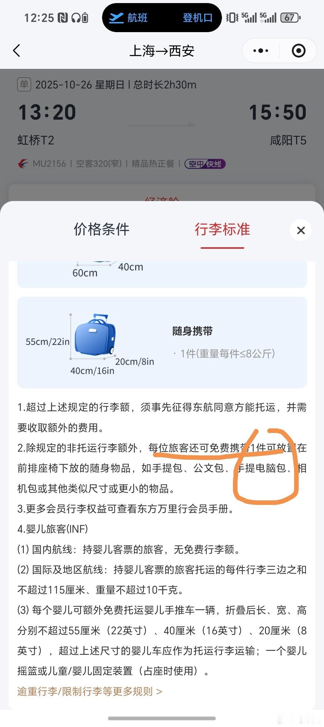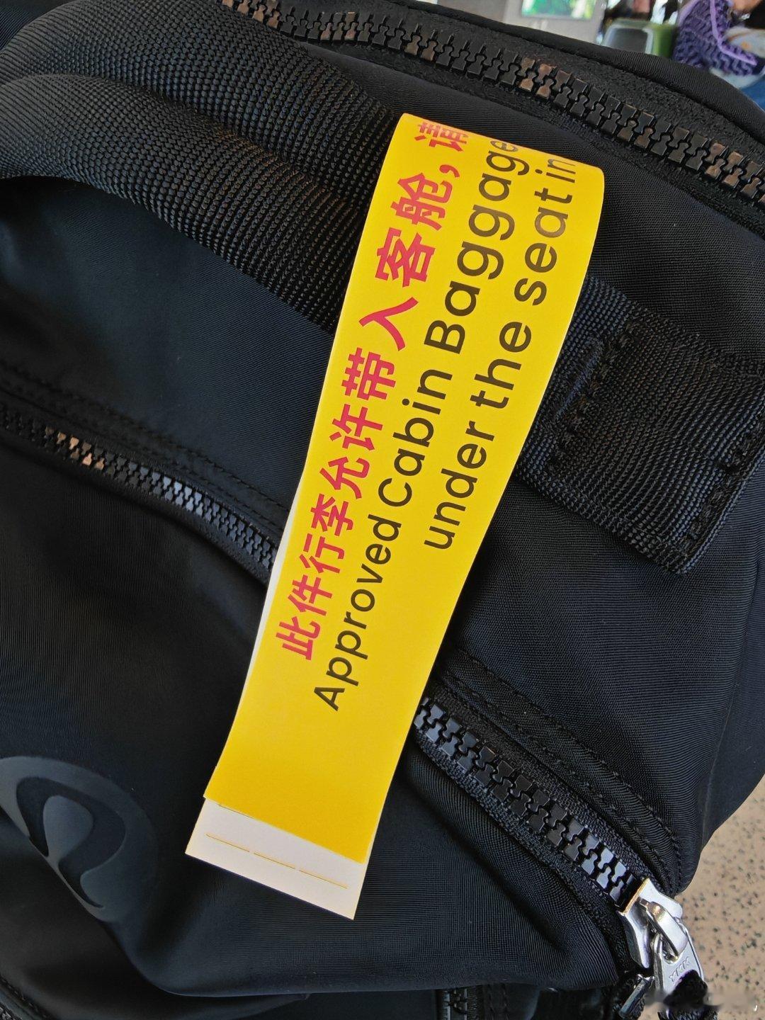 我在候机的时候查了一下东航订票的要求,明确写明一个登机箱可以再带一个电脑包,我不知道现场跟我battle的东航工作人员是怎么做到义正言辞说只能一件的,还给我贴一个“允许行李代入客舱”的标识,太特么歧视了。。