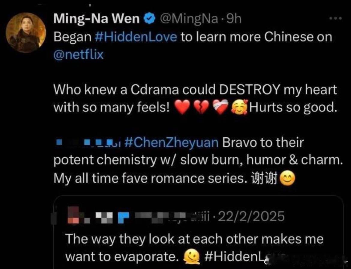 曾出演《神盾局特工》《花木兰》等影视作品的好莱坞演员温明娜也看了陈哲远的一笑随歌诶