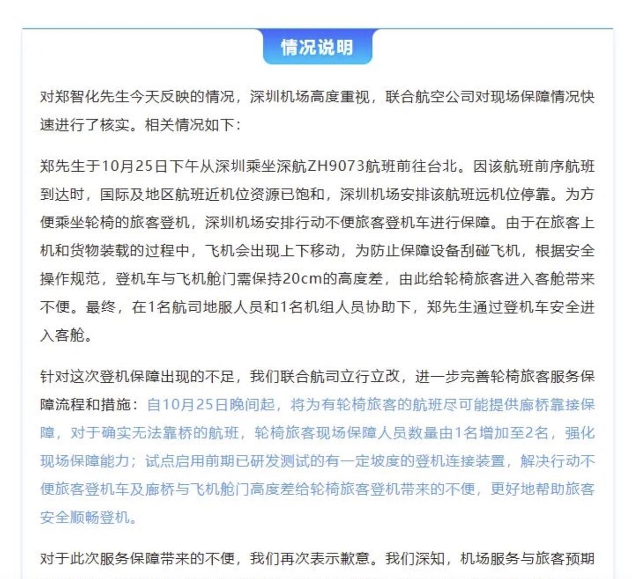 果然还是名人的影响力比较大,如果吐槽深圳机场的是你我一样的普通人,或许根本没人关注,更不用说深圳机场亲自下场道歉了! 事情的起因是歌手郑智化在网上吐槽,说在深圳机场乘坐飞机的时候,升降车升至机门后,离机门地板足有25厘米距离,导致他的轮椅推不进飞机,腿也无法跨进机门,而面对他的这种困境,操纵升降车的司机却是冷眼旁观,最后他是“连滚带爬”进了飞机。很快深圳机场就发了情况说明,在道歉的同时,解释了一下具体的原因,并且承诺将会改进工作。 这边旅客刚吐槽,那边机场就迅速道歉改进,怎么看都应该夸一下的,可为何网上却是吐槽不断呢?因为这个问题不是刚出现的,而是一直就存在的,而且我相信之前也应该有坐轮椅的旅客,他们也绝对遇到过不方便,他们也肯定吐槽过。如果机场做出改变的话,就不会有后边郑智化的吐槽。那为何机场一直没改变呢?无非是因为他们不重视而已。毕竟普通旅客人微言轻,就算是在网上发声,也不过是石沉大海而已。 可歌手郑智化就不一样了,他的影响力巨大,所以深圳机场才会重视。事实上这样的事情,是一点都不奇怪的。就像是咱们一些城市的盲道建设一样,你别说是盲人来走了,就算是正常人,你也是走不明白的。这个问题也存在很久了吧,可为何一直都没有得到有效解决呢?无非是因为建设盲道的人,他们不需要走盲道,而真正的盲人,他们不敢走盲道,所以所谓的盲道,不过就是聋子的耳朵,摆设而已。 如果让一个名人走盲道摔倒了,又或者是掉沟里了,你信不信几天之内,城市的盲道就会大变样!所以郑智化吐槽深圳机场这个事,深圳机场的态度才会引人质疑。不过咱从另外一个角度看,这件事也算是一件好事,至少以后再有坐轮椅的人乘飞机,不用那么狼狈了。所以如果有可能的话,我倒是希望一些名人啊,多体验一下我们普通人的生活。