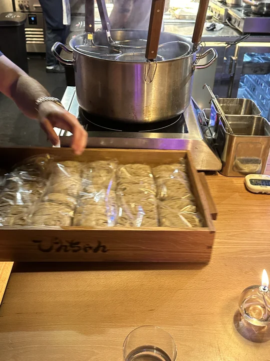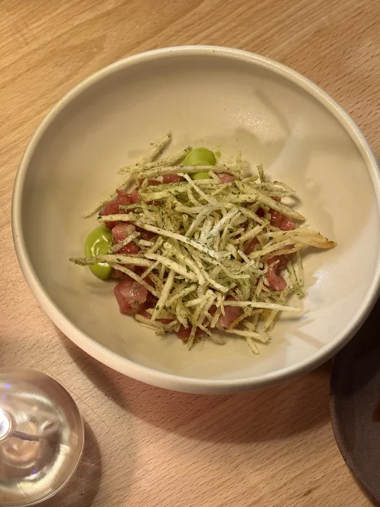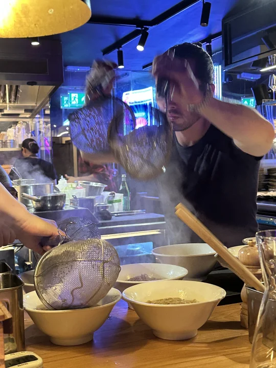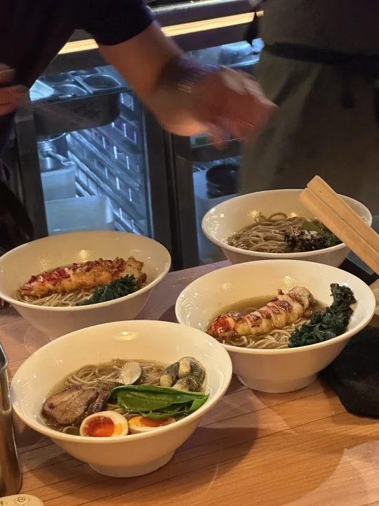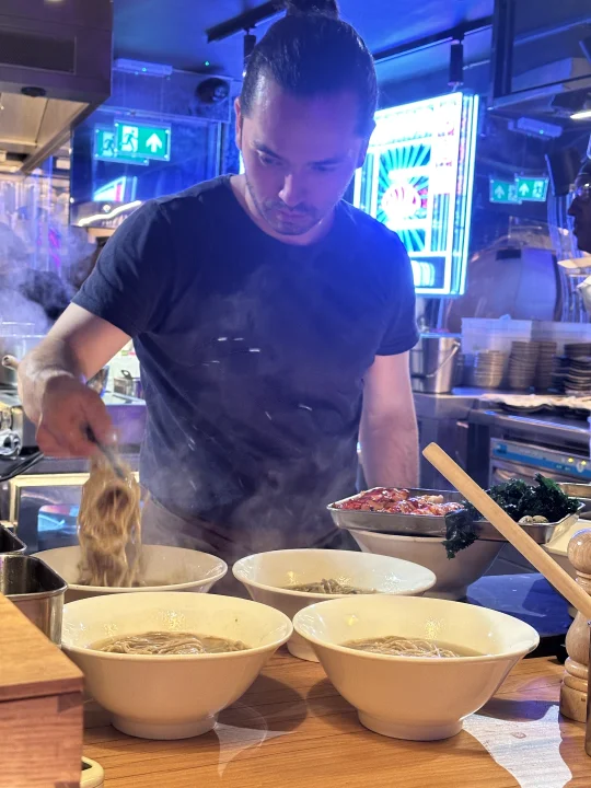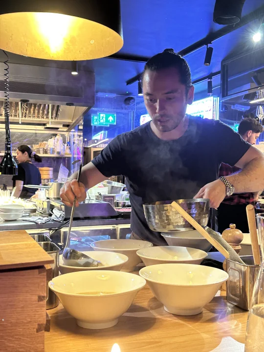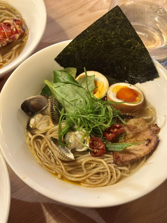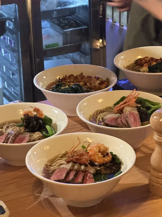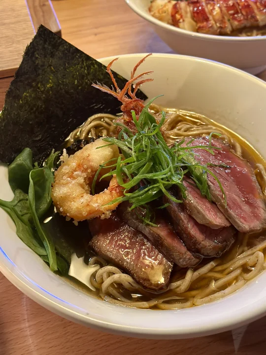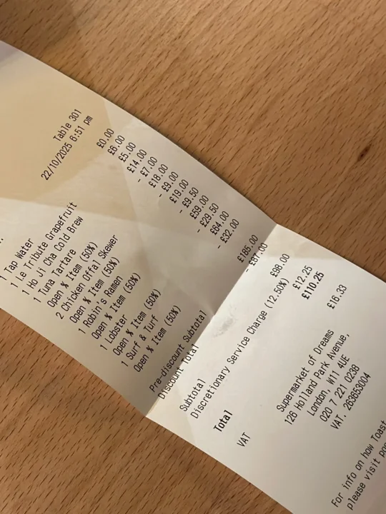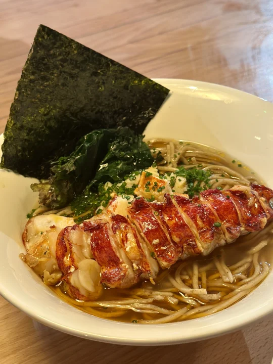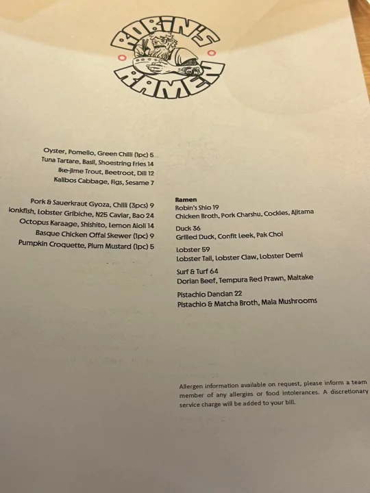 🍜Robin’s Ramen 📍Supermarket of Dreams, 126 Holland Park Ave, London W11 4UE 趁着半价30号结束前,火速在一个工作日的晚上约了朋友一探究竟。和Dorian同集团的拉面小铺,在杂货铺里摆摊,蓝不拉几的灯光无比赛博朋克。 🍜拉面店,那就先说说拉面 🎉是好吃的,半价的话,我已经想再去一次了! 🥇最爱的是Shio盐拉面 鸡骨汤,猪骨叉烧,蛤蜊(好肥美,但朋友吃的那口说有沙)温泉蛋…这款性价比最高,且是我个人最爱!以后不是半价,我也愿意再回访! ▪️龙虾面 很有特色,龙虾Q弹鲜美,还有挪威海鳌虾。配上虾油提鲜,一口下去就是海洋潮湿,鲜美,扑面而来的味道。 ▪️surf and turf 海陆全面 原价64,可以尝试一下但我以后不会回购。牛排是Dorian同款,确实不错。红虾天妇罗,薄脆口感有韧劲。面汤里有一股牛肉香。我感觉这款和龙虾那款,面都是多余的😂直接吃topping就很满足! ▪️面本身,我吃着还蛮惊喜的!我平时爱吃细面,这款带微粗,带有荞麦颗粒感,很有嚼劲,蘸上汤汁,吃着痛快! 🎉前菜也有惊喜 ▫️Tuna Tartare, Basil, Shoestring Fries 吞拿鱼塔塔配上这个极细薯条,这口感,omo喜欢! ▫️Basque Chicken Offal Skewer 毕竟是直火炭烤出名的餐饮集团出品,这个鸡肉串深得我心,有一两口是鸡肝块,口感丰富这款真的拿捏的很好👌 ▪️吃完一次就想再吃第二次(if是半价的情况下) ▪️午餐只有叉烧面,想点丰富的就晚上去 ▪️提前订位,网上订的时候10胖每人定位费 ▪️运气好可以坐在厨房前(如我们)灯光明亮,还可以看chefs满头大汗的下面,调味 ▪️得一次性点完要吃的东西,不能加单 ▪️结账时提醒一下服务员➖押金 已经在订下周的位置了😆