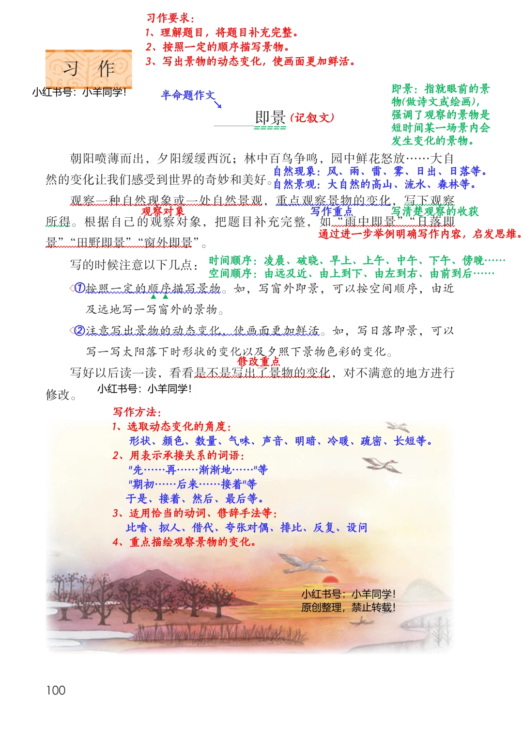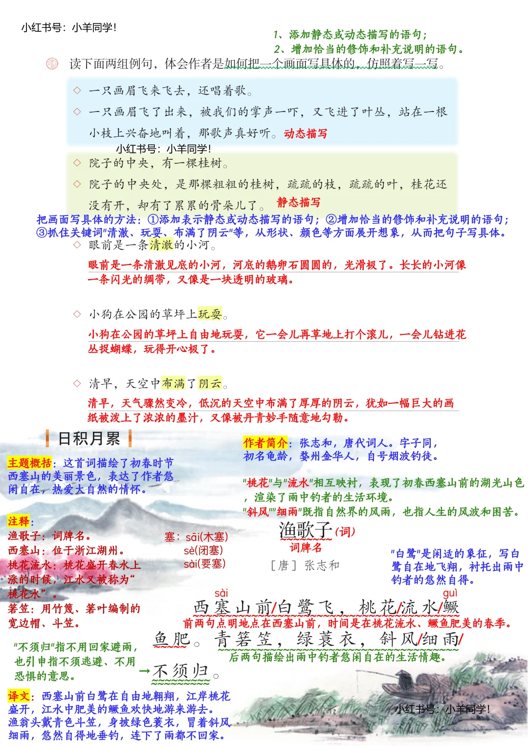 学习目标: ✅习作:_______即景 ✅交流平台:能交流在课内外阅读中遇到的动态描写和静态描写的语句,初步体会这样表达的好处写宣传语,首先要有对象意识,明确宣传语是写给谁的,他们的喜好是什么;还要明确宣传活动的特点,突出活动的优势。并能主动积累。 ✅词句段运用:设计海报;如何运用静态和动态描写,把一个画面写具体。 ✅日积月累:《渔歌子》【唐】张志和 ⚠️原创整理,禁止转载发布网络平台或商用。