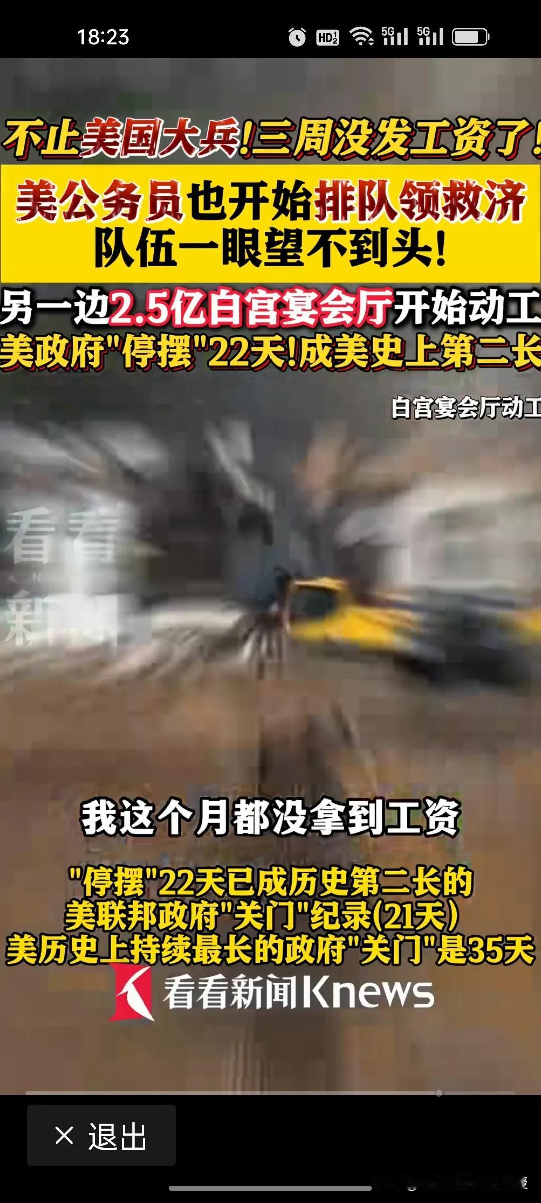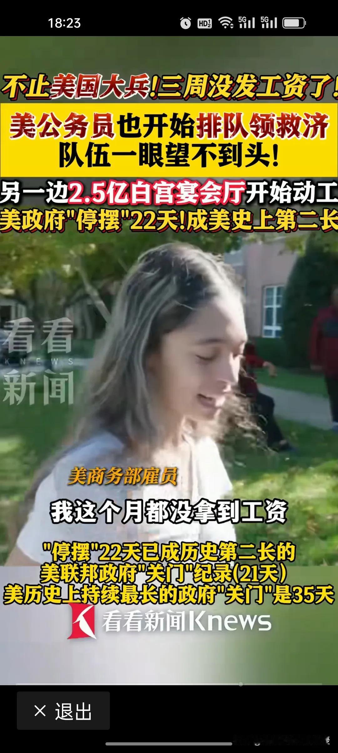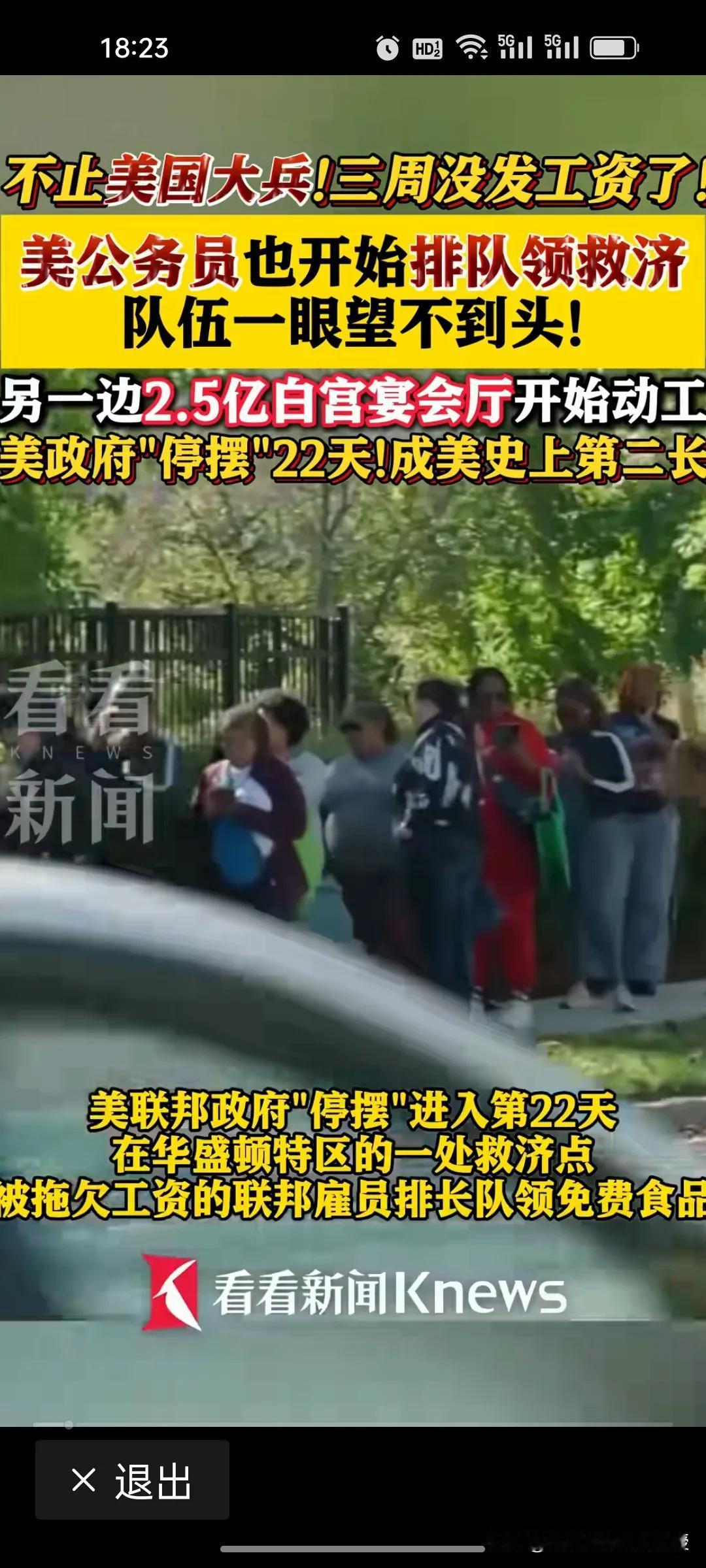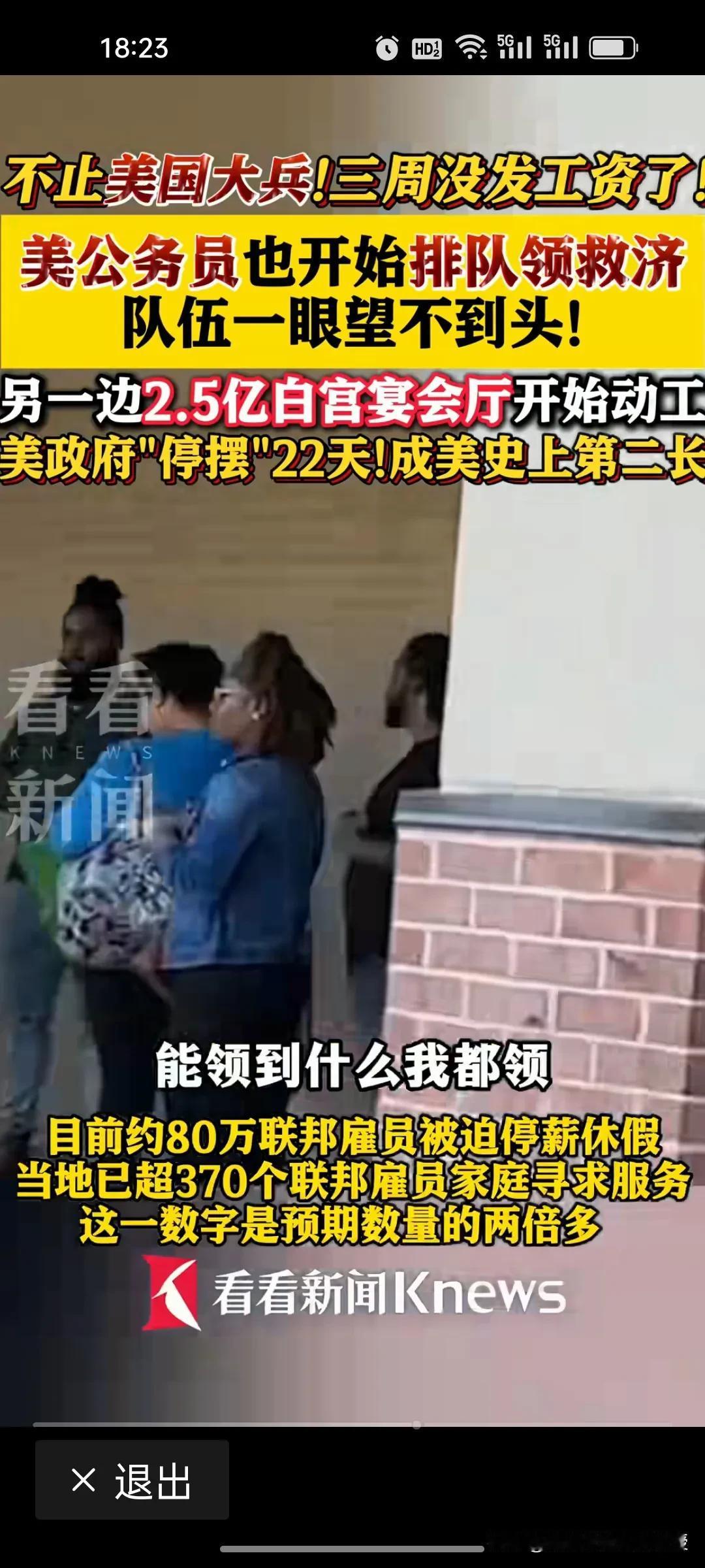 太离谱了,美国政府公务员都开始排长队领救济!美国政府停摆22天,为史上第二长关门纪录,政府不给公务员发工资,看下图,公务员也开始排长队在华盛顿领救济食品了。这位商务部的雇员称能领到什么她都要领,目前已经有370个联邦雇员家庭寻求帮助了。照理说联邦雇员的工资也不低,三周不发工资,大家都来排长队领救济食品了,看来美国人确实不爱存钱啊!特朗普也不管政府雇员的生活,还兴致勃勃地花3亿美元大修白宫东翼建宴会厅,今天还兴高采烈地抵达马来西亚国事访问,与欢迎舞队一起载歌载舞,好不快活!