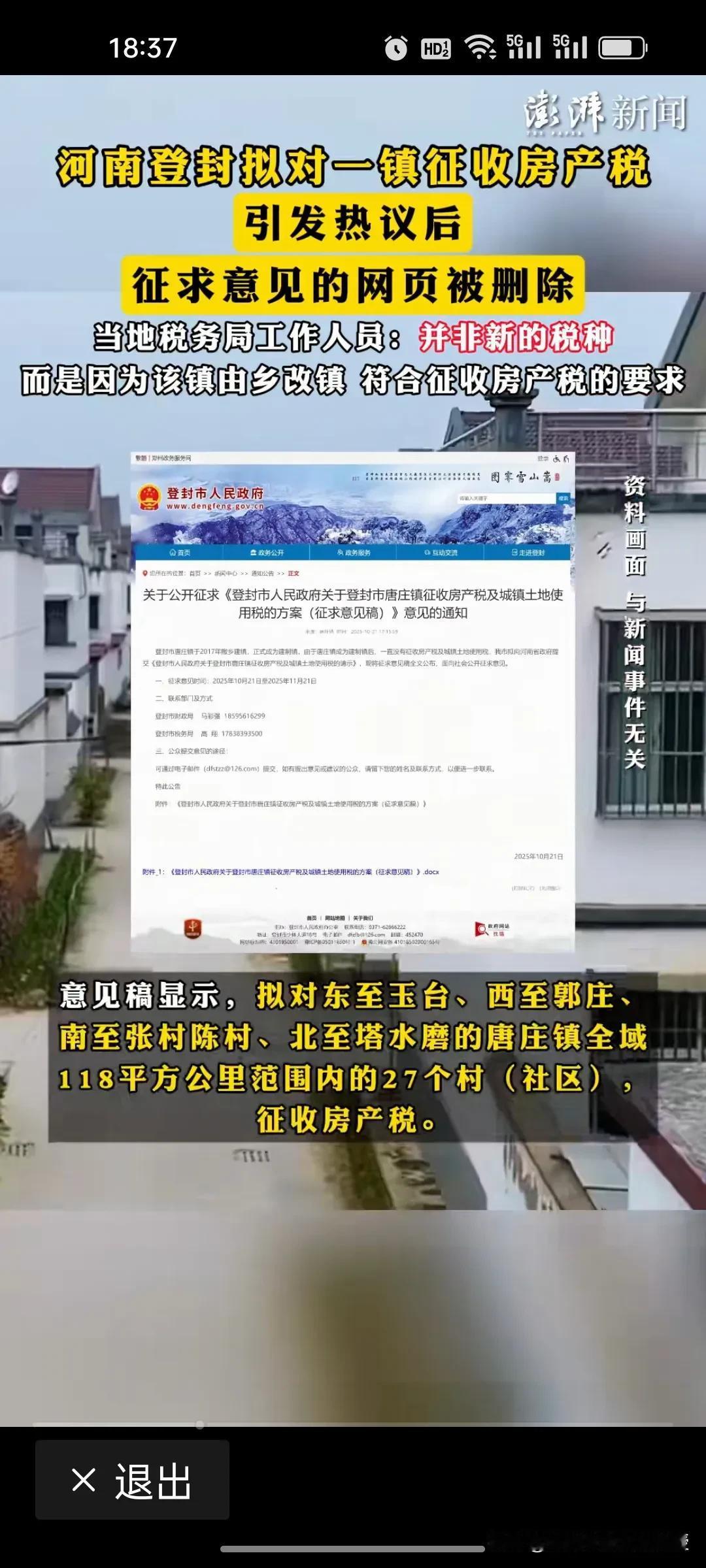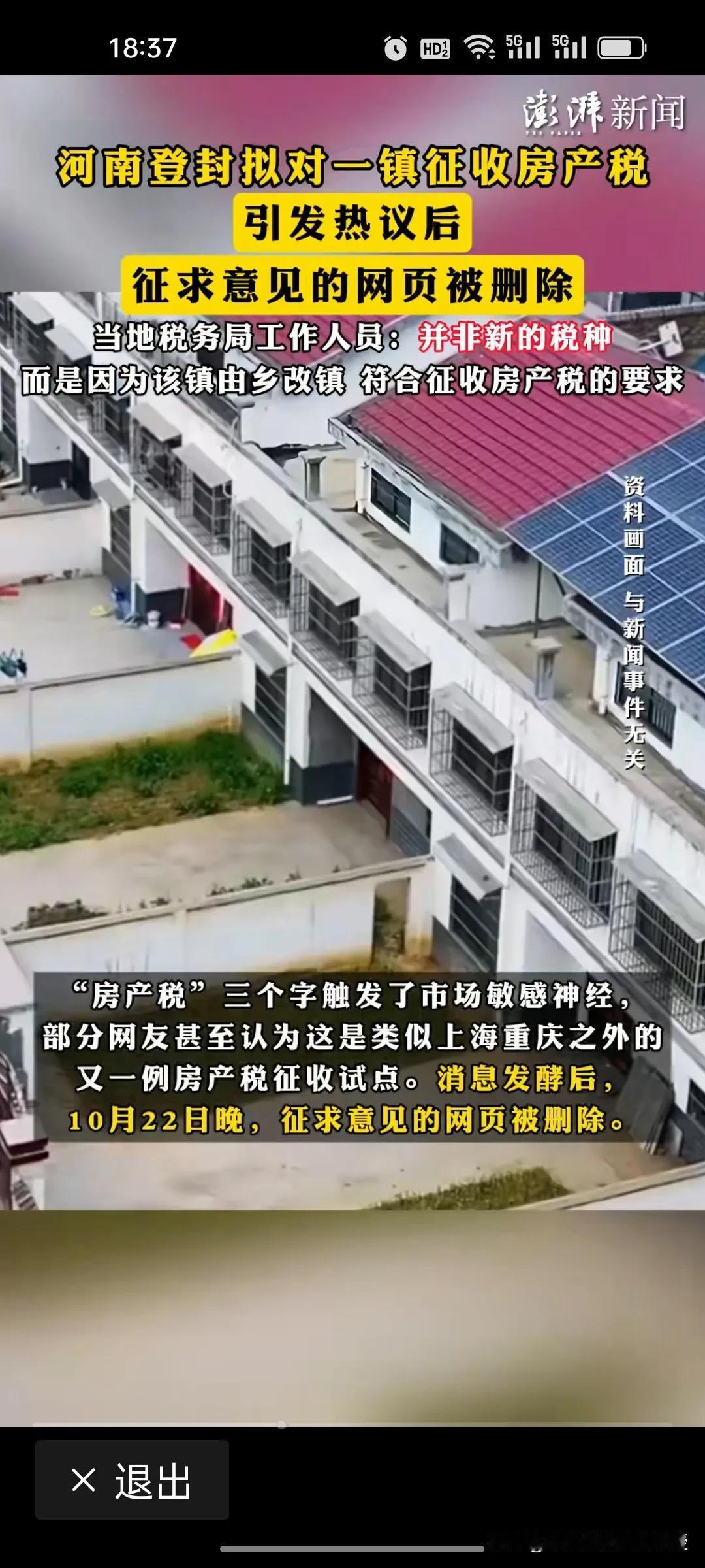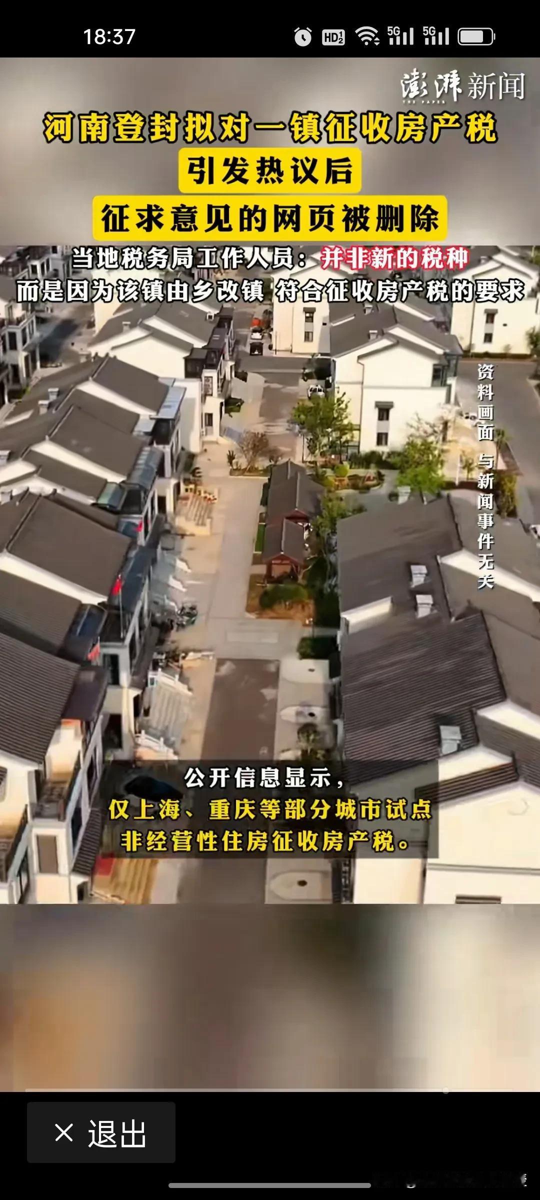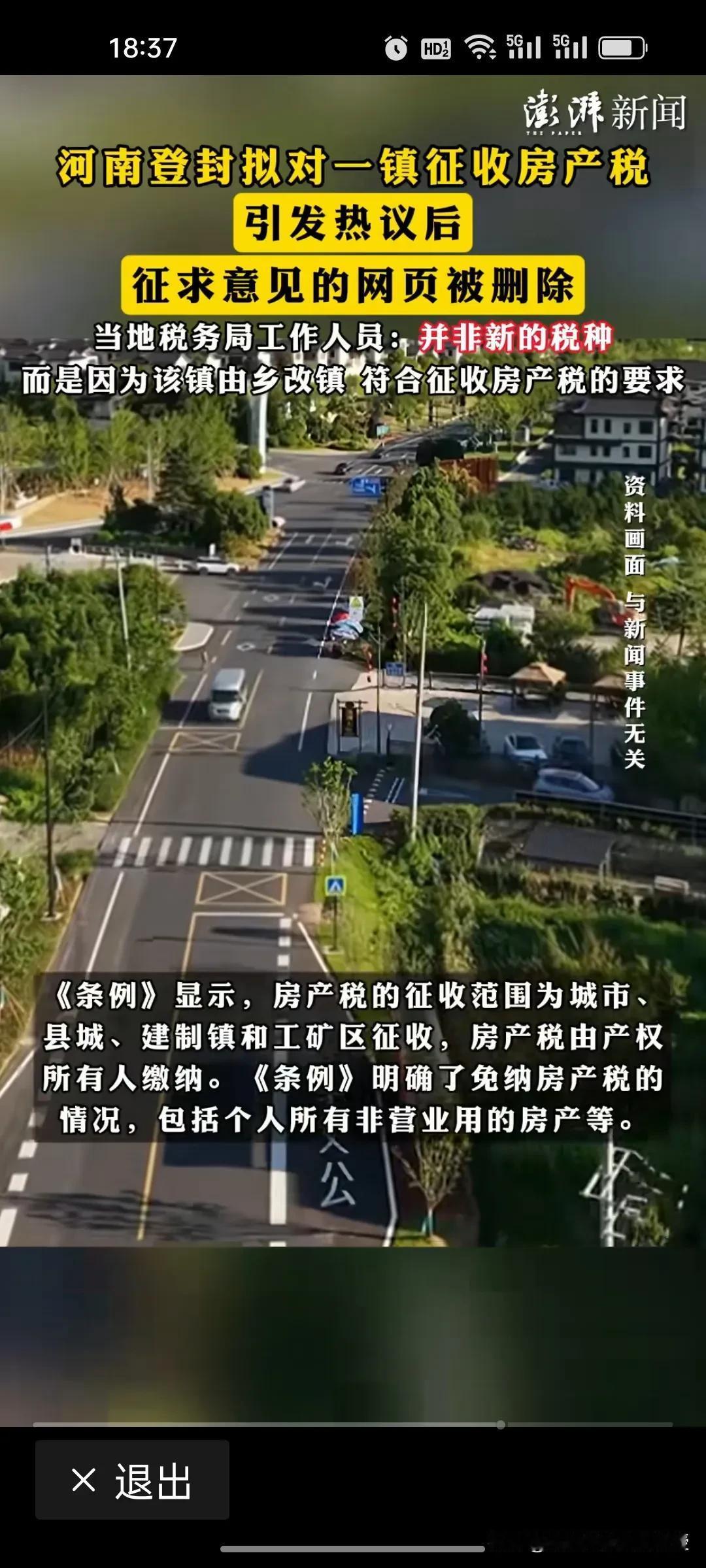 河南登封要对一个镇收房产税?当地财政这么捉襟见肘了吗?根据《澎湃新闻》报道,河南登封市发布了一则对唐庄镇征收房产税的征求意见稿,不过目前已经被删除。 我国房产税试点的城市很少,目前仅有重庆和上海,并没有全国范围铺开,在一个四五线城市的一个镇突然开始要收房产税,确实比较唐突,登封市里都没收,为什么要从唐庄镇开始收呢?只能说这个突兀的征求意见稿藏着当地土地财政转轨期的无奈与试探。