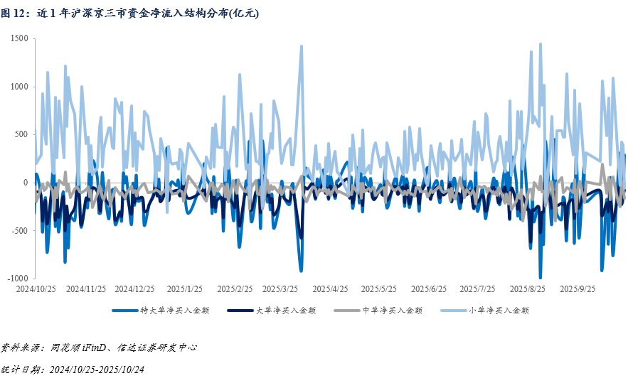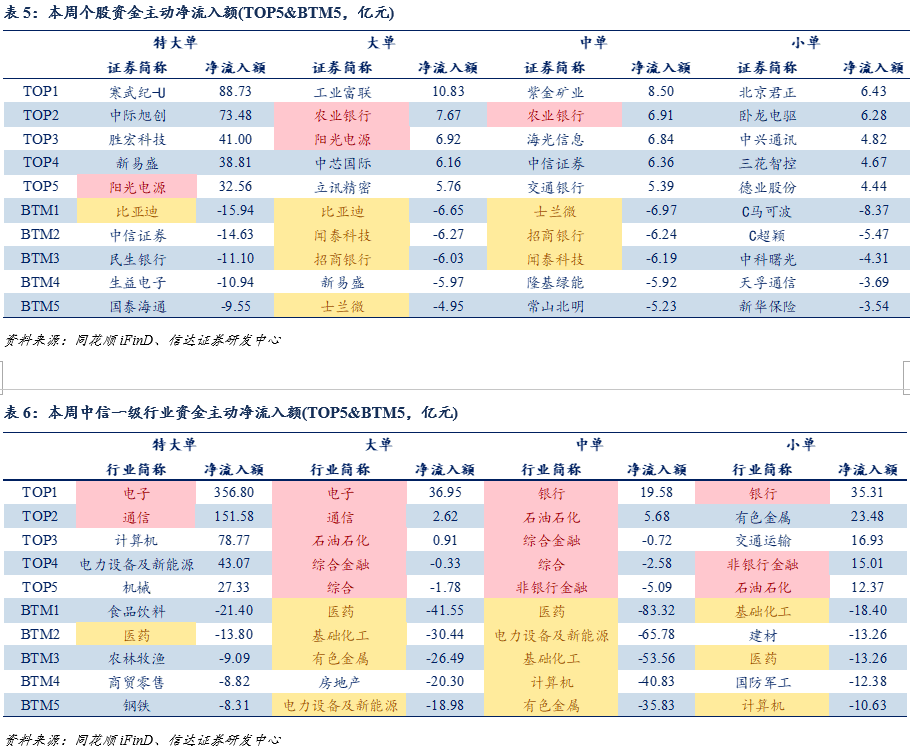 周内资金情绪波动较大,特大单全周净流入约275.74亿元。主力资金流:本周主力净流入电子、通信,流出有色、医药。(1)个股:主力净流入&中小单净流出:中际旭创、胜宏科技、立讯精密、工业富联、天孚通信等。主力净流出&中小单净流入:比亚迪、北方稀土、紫金矿业、中金黄金、华天科技等。(2)行业:主力净流入&中小单净流出:电子、通信、计算机、建材、石油石化等。主力净流出&中小单净流入:有色金属、医药、基础化工、汽车、电力设备及新能源等。主动资金流:本周主买净额约-130.60亿元,主动资金净流出电子、通信。(1)个股:主动资金更看好寒武纪-U、中际旭创、工业富联、阳光电源、胜宏科技等标的,比亚迪、士兰微、生益电子、闻泰科技、隆基绿能等标的遭主动资金净卖出。(2)行业:主买净额居前的行业有:电子、通信、银行、石油石化、计算机等;流出较多的行业有:医药、基础化工、商贸零售、食品饮料、国防军工等。