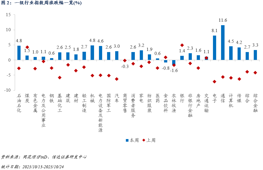 行业指数表现回顾:本周(2025/10/20-2025/10/24)市场风险偏好回升,科技成长与高端制造赛道领涨,消费及部分传统周期板块表现承压。周涨跌幅排名居前的行业有通信、电子、机械、石油石化、电力设备及新能源等,收益率依次为11.56%、8.11%、4.80%、4.75%、4.64%;周涨跌幅排名靠后的行业包括农林牧渔、食品饮料、商贸零售、医药、钢铁等,收益率依次为-1.59%、-0.81%、-0.28%、0.56%、0.65%。