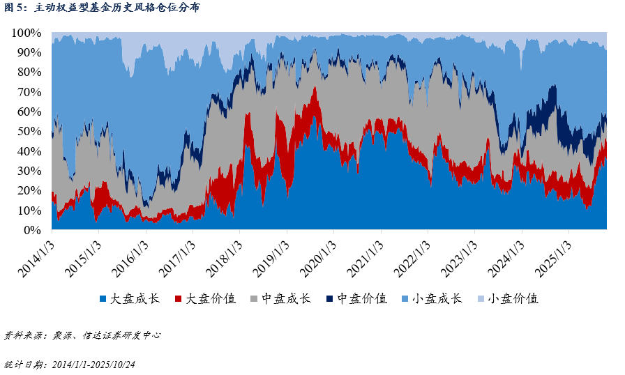 从风格仓位来看,近期主动权益风格基金向大盘成长、小盘价值板块集中。截至2025/10/24,主动偏股型基金大盘成长仓位35.19%(较上周下降1.2pct),大盘价值仓位9.28%(较上周下降0.27pct),中盘成长仓位6.62%(较上周下降1.3pct),中盘价值仓位5.17%(较上周上升0.78pct),小盘成长仓位34.56%(较上周上升1.68pct),小盘价值仓位9.18%(较上周上升0.31pct)。