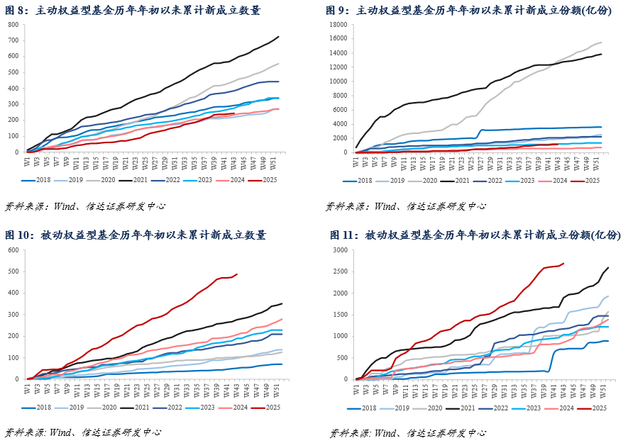 本周境内新成立基金数目共计24只,其中主动权益型基金2只;主动权益型基金新发总份额约为19.81亿份,为近1年59.6%分位。2024年主动权益型基金新发269只,规模合计约720.26亿份,约为2023年同期水平的52%;被动权益型基金新发285只,规模合计约1420.14亿元,规模远超2023年同期。今年以来,主动权益型基金新发243只,规模合计约1152.62亿元,超过去年同期;被动权益型基金新发487只,规模合计2689.85亿元,远超历年同期。