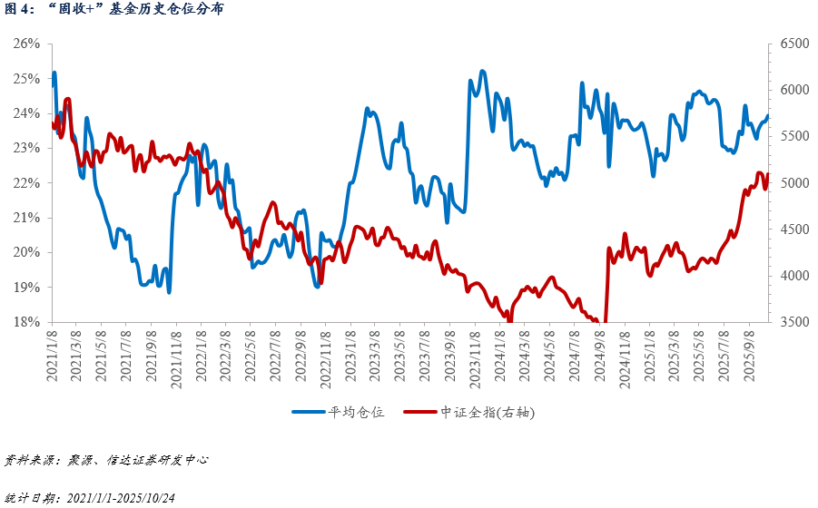 从整体仓位来看,截至2025/10/24,主动权益型基金的平均仓位约为90.02%。其中,普通股票型基金的平均仓位约为92.60%(较上周下降0.01pct),偏股混合型基金的平均仓位约为90.66%(较上周下降0.25pct),配置型基金的平均仓位约为87.77%(较上周下降0.31pct);“固收+”基金平均仓位约为23.52%,较上周上升0.25pct。