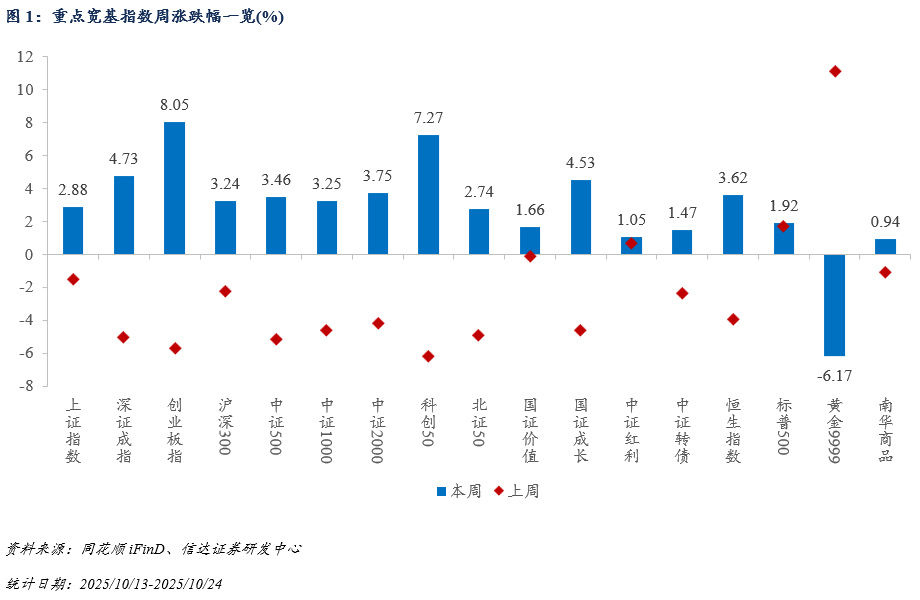 宽基指数表现回顾:本周(2025/10/20-2025/10/24)A股宽基指数全线走强,结构性分化特征显著,高风偏风格相对强势,创业板、科创板领涨。截至2025/10/24,上证指数报收3950.31点,周涨跌幅约2.88%;深证成指报收13289.18点,周涨跌幅约4.73%;创业板指报收3171.57点,周涨跌幅约8.05%;沪深300报收4660.68点,周涨跌幅约3.24%。