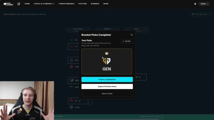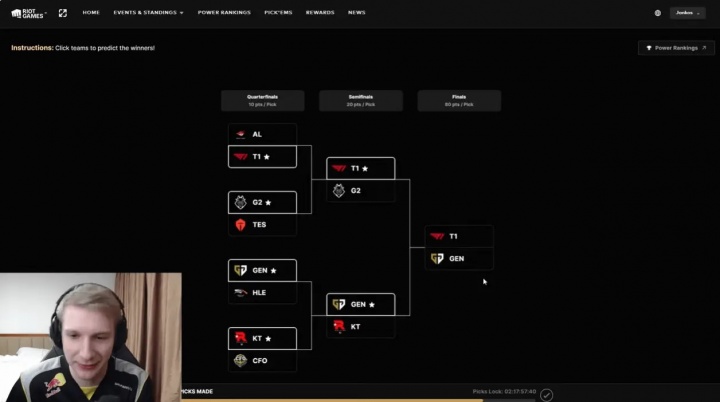 直播吧10月26日讯 今日Jankos在直播中预测淘汰赛,具体如下:四分之一决赛:T1击败AL、G2击败TES、GEN击败HLE、KT击败CFO;半决赛:T1击败G2、GEN击败KT;决赛:GEN击败T1夺冠。