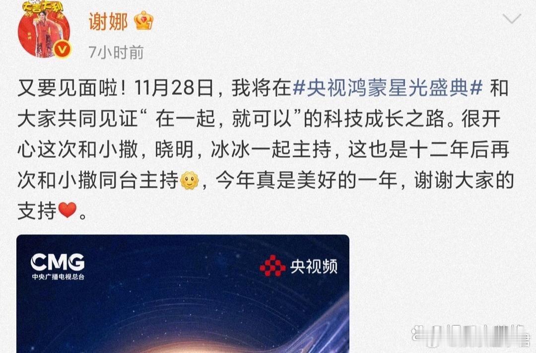 10月26日,央视频发文宣布鸿蒙星光盛典主持人阵容,透露谢娜、黄晓明、撒贝宁、王