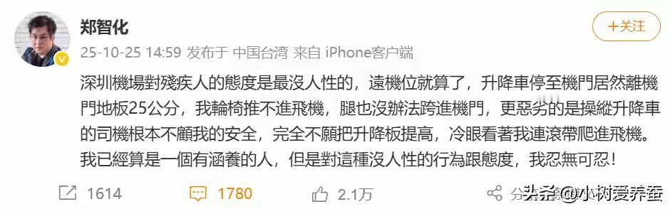 郑智化妙就妙在用了“连滚带爬”这个热词,一下子把博文升华了,让大家自动脑补出残疾人登机的画面。 作为一个岛内音乐人,郑智化不会不知道王世坚和《没出息》,如果他用《没出息》中的歌词玩梗,那“连滚带爬”只是个形容词,是表示登机过程有小曲折。如果是个动词,那就是另一码事了。