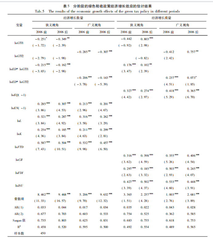 为了考察绿色税收政策的经济增长数量和质量效应在2006年政府施行节能减排政策前后是否具有明显的差异,本文以2006年为断点把样本期分为两个阶段进行比较分析(见表5)。由表5可知,从经济增长数量的视角出发,绿色税收政策对其影响并没有表现出明显的差异,但交叉项的系数表明,环境分权虽然依旧抑制绿色税收政策对经济增长数量产生的负面影响,但是其抑制作用却在国家节能减排政策实施后得到了显著的下降。究其原因,这一政策的实施会促使地方政府由“唯GDP”向“绿色GDP”的地方发展模式转变,这会增强地方政府落实环境政策的激励,增加“逐底竞争”的成本,实现地方经济的可持续发展。从经济增长质量的视角出发,绿色税收政策在2006年之前不利于经济增长质量的提升,但是在2006年强制实施节能减排政策后开始对经济增长质量的提升产生了显著的促进作用;交叉项的估计结果进一步表明,在2006年之前,环境分权恶化绿色税收政策对经济增长质量的抑制效应,但是在2006年后转变为促进绿色税收政策的经济增长质量驱动效应。
