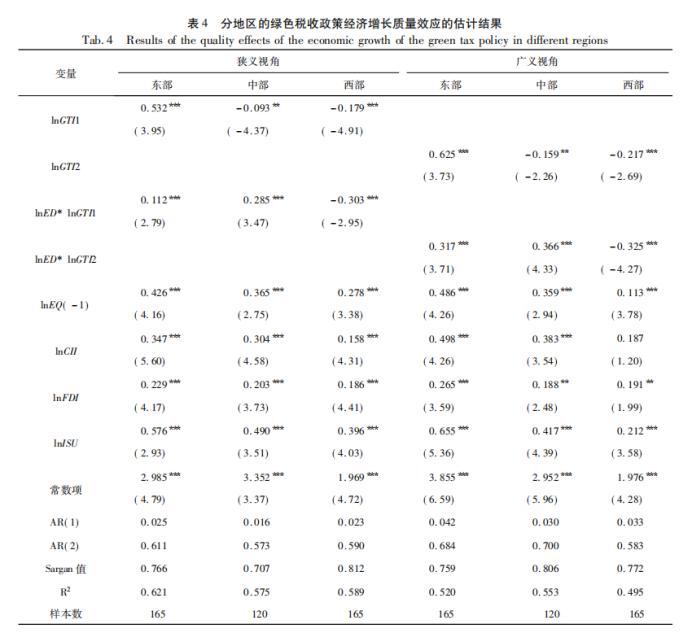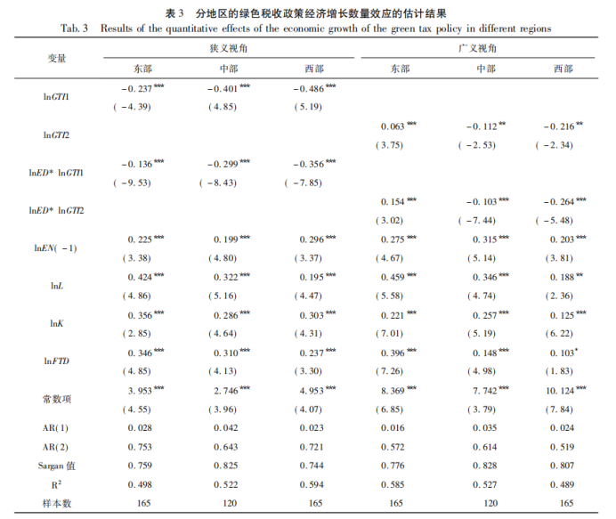 考虑到中国各地区在经济发展阶段和资源禀赋条件等方面存在着明显的差异,因此,需要分为东部(东部地区为:京、冀、浙、沪、粤、闽、苏、琼、鲁、辽、津)、中部(中部地区为:皖、赣、晋、鄂、黑、豫、湘、吉)和西部地区(西部地区为:桂、川、蒙、渝、黔、陕、宁、新、甘、滇、青)来进一步考察绿色税收政策的经济效应的地区异质性问题,结果如下所示。