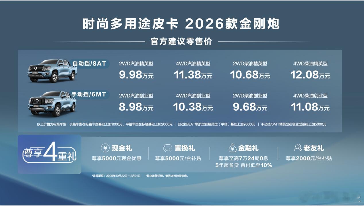 日前,2026款金刚炮焕新上市,8AT车型官方建议零售价9.98万元起,6MT车型为8.98万元起。并同步推出5000元现金礼、5000元置换礼、2000元老友礼以及7万24期0息金融补贴四重豪礼。金刚炮累计销量已突破10万台,对26款车型,我们总结出五大亮点。