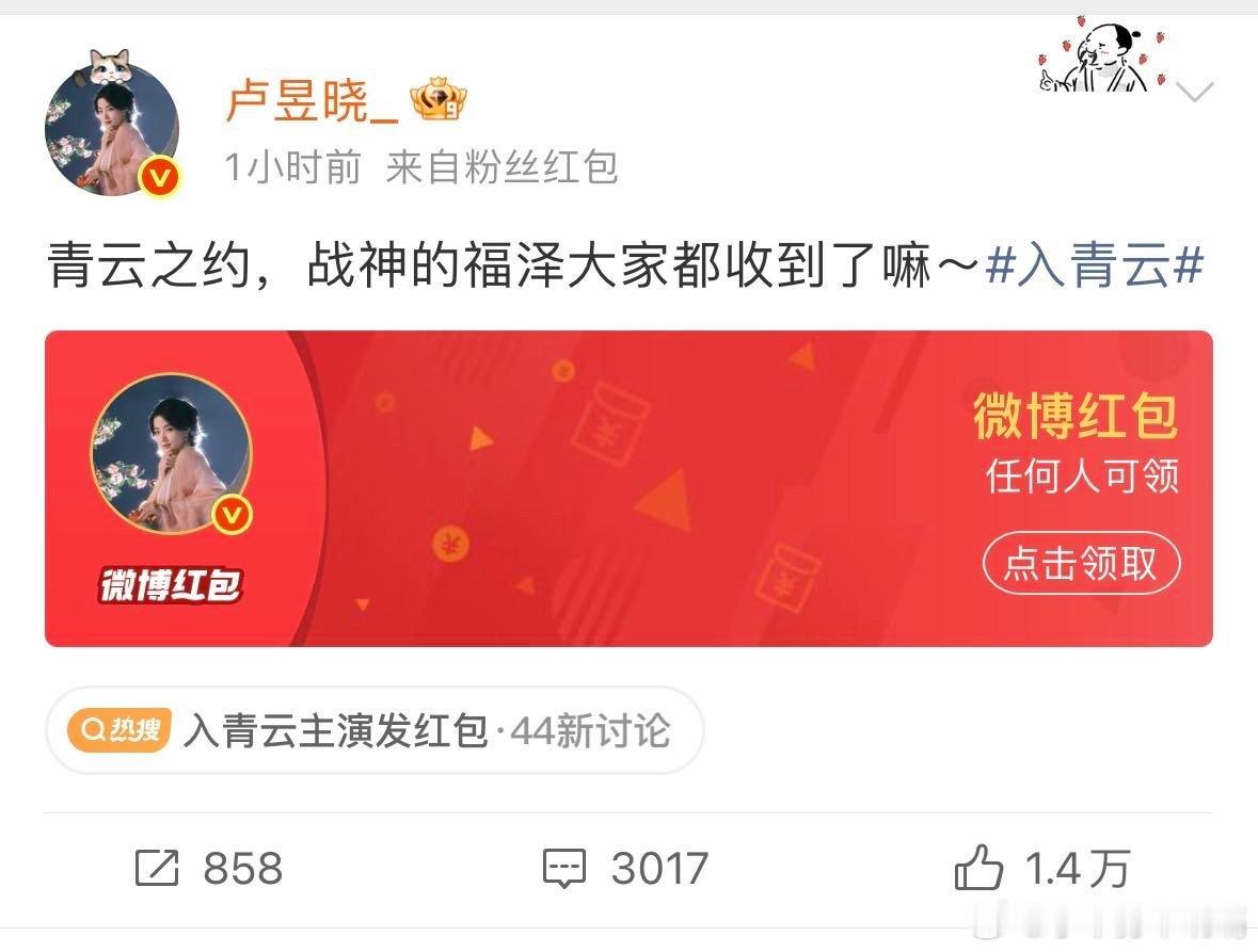 卢昱晓的红包是自己画的卢昱晓的新剧今天超点,现在的战神福泽怎么不算是随份子钱嘞~卢昱晓真的好用心对待每部剧诶,红包都是自己画的!