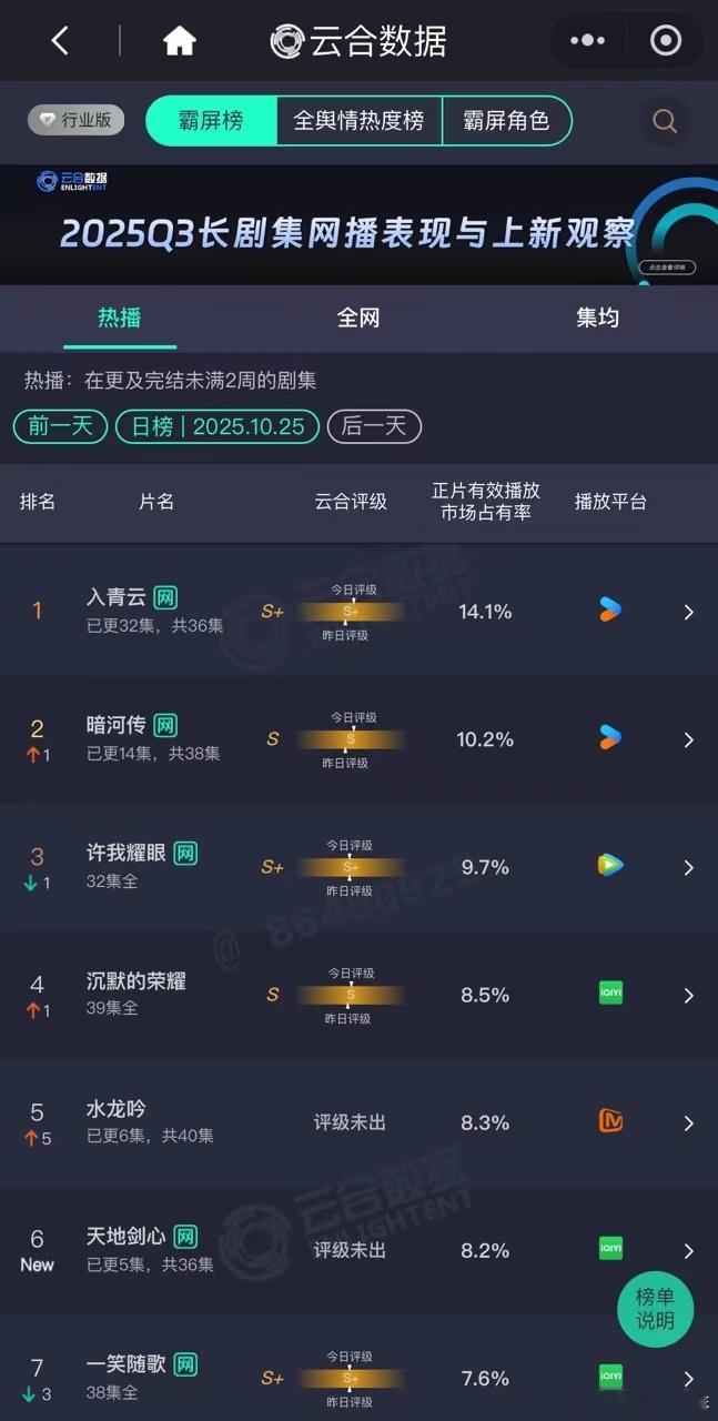 入青云云合第一 瞧瞧昨日云合,侯明昊、卢昱晓主演的《入青云》如同一颗璀璨新星,以14.1%的占比拿下第一👖,未来发展定会一路繁花!