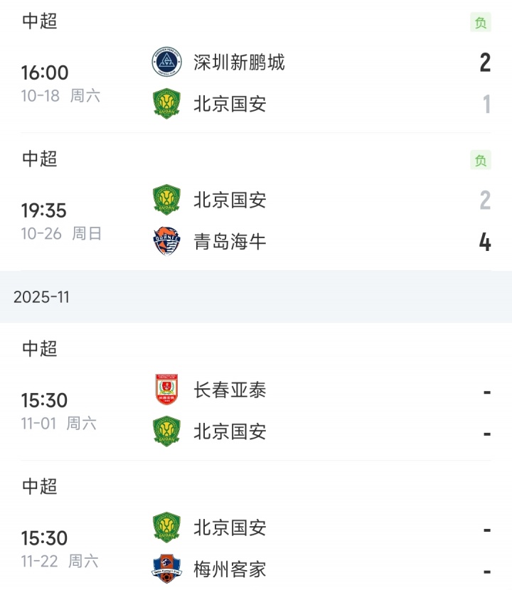 最后4轮中超,国安要先后交手深圳新鹏城、青岛海牛、长春亚泰、梅州客家4支保级球队,堪称保级判官。在前两场比赛中,国安先后1-2新鹏城,2-4青岛海牛,接下来要面对的亚泰和梅州分别是联赛垫底和倒数第2。