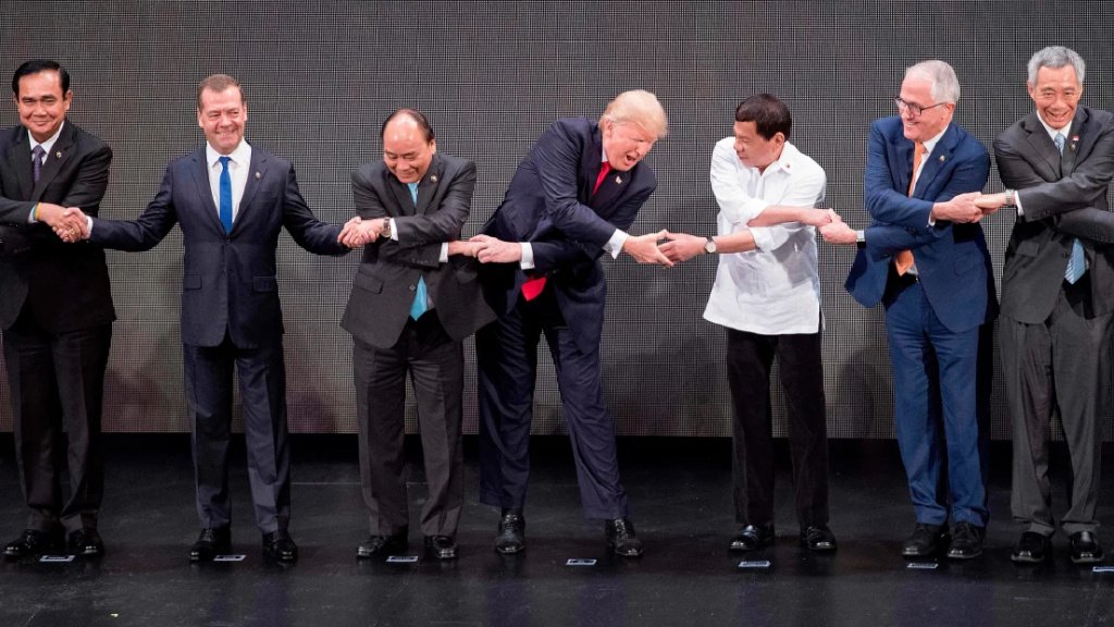 当时美国媒体对于特朗普的菲律宾之行,多持批评态度,认为其“外交表现尴尬、战略短视以及对地区盟友的疏离感”。特别是当时在各国领导人大合照环节中,特朗普被捕捉到挣扎着进行“东盟式握手”的尴尬瞬间,更是被外界解读为其不适应多边外交礼仪,凸显“美国优先”政策下对东盟共识机制的漠视。