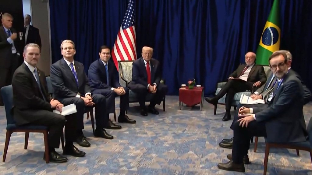 26日,美国总统特朗普与巴西总统卢拉举行会晤,美国国务卿鲁比奥、美国财长贝森特陪同。
