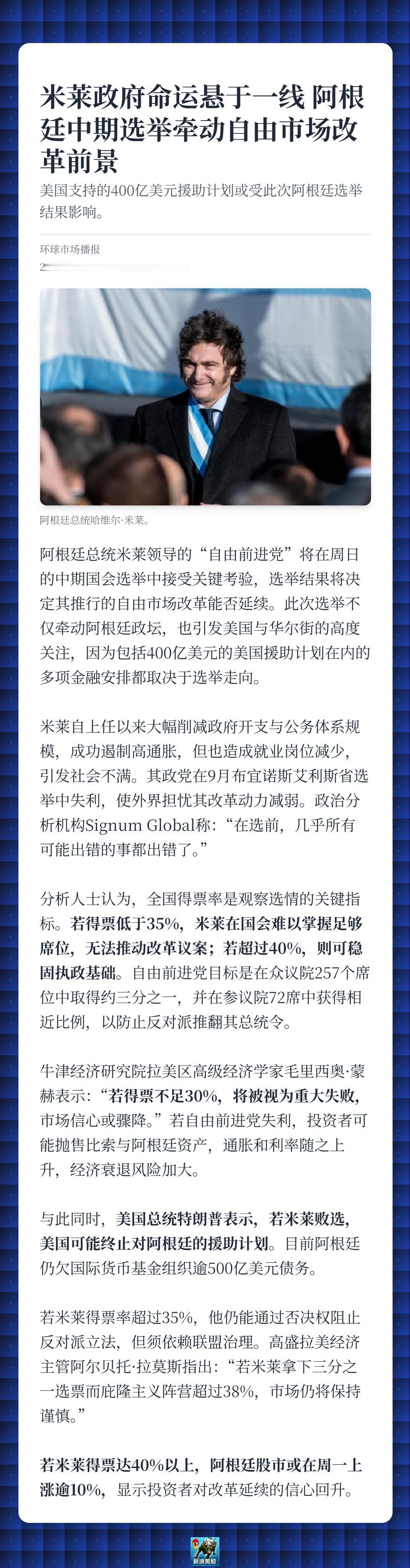 【米莱政府命运悬于一线,阿根廷国会中期选举牵动自由市场改革前景】阿根廷总统米莱领导的“自由前进党”将在周日的中期国会选举中接受关键考验,选举结果将决定其推行的自由市场改革能否延续。此次选举不仅牵动阿根廷政坛,也引发美国与华尔街的高度关注,因为包括400亿美元的美国援助计划在内的多项金融安排都取决于选举走向。 米莱自上任以来大幅削减政府开支与公务体系规模,成功遏制高通胀,但也造成就业岗位减少,引发社会不满。其政党在9月布宜诺斯艾利斯省选举中失利,使外界担忧其改革动力减弱。政治分析机构Signum Global称:“在选前,几乎所有可能出错的事都出错了”。 阿根廷阿根廷选举米莱市场改革 米莱政府命运悬于一线,阿根廷中期选举牵动自由市场改革前景