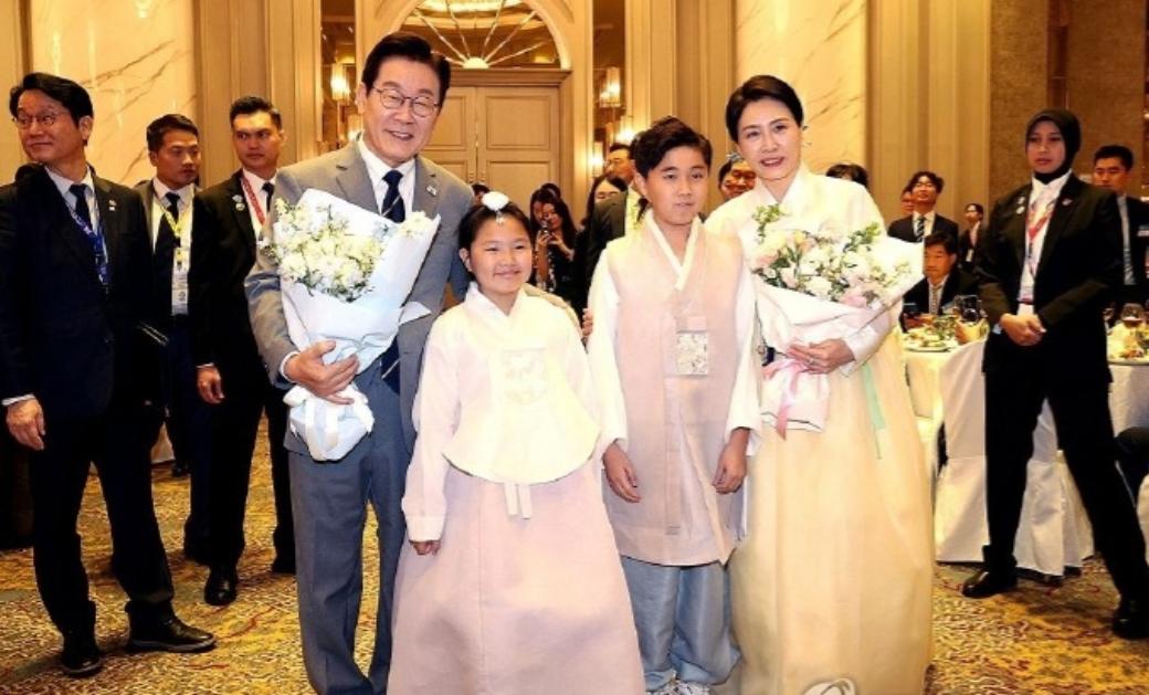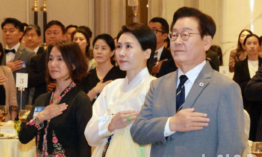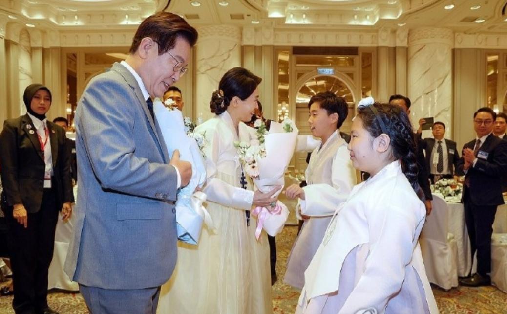 李在明抵达马来西亚后出席韩同胞宴会,一身蓝西服好减龄!10月26日李在明抵达马来西亚吉隆坡,带着妻子出席马来西亚的韩同胞为他举行的欢迎宴会。 只见他并没有穿深色服装,而是选择蓝色西服套装,系着深色领带,一身清爽蓝色穿在身上,整个人年轻不少,和穿着韩服裙的妻子走在一起尽显成熟男人魅力! 看来男人想帅气,还是得与众不同,穿着蓝色衣服的韩总统人变年轻了不说,走在人群中格外惹眼,都抢了妻子的镜头了。