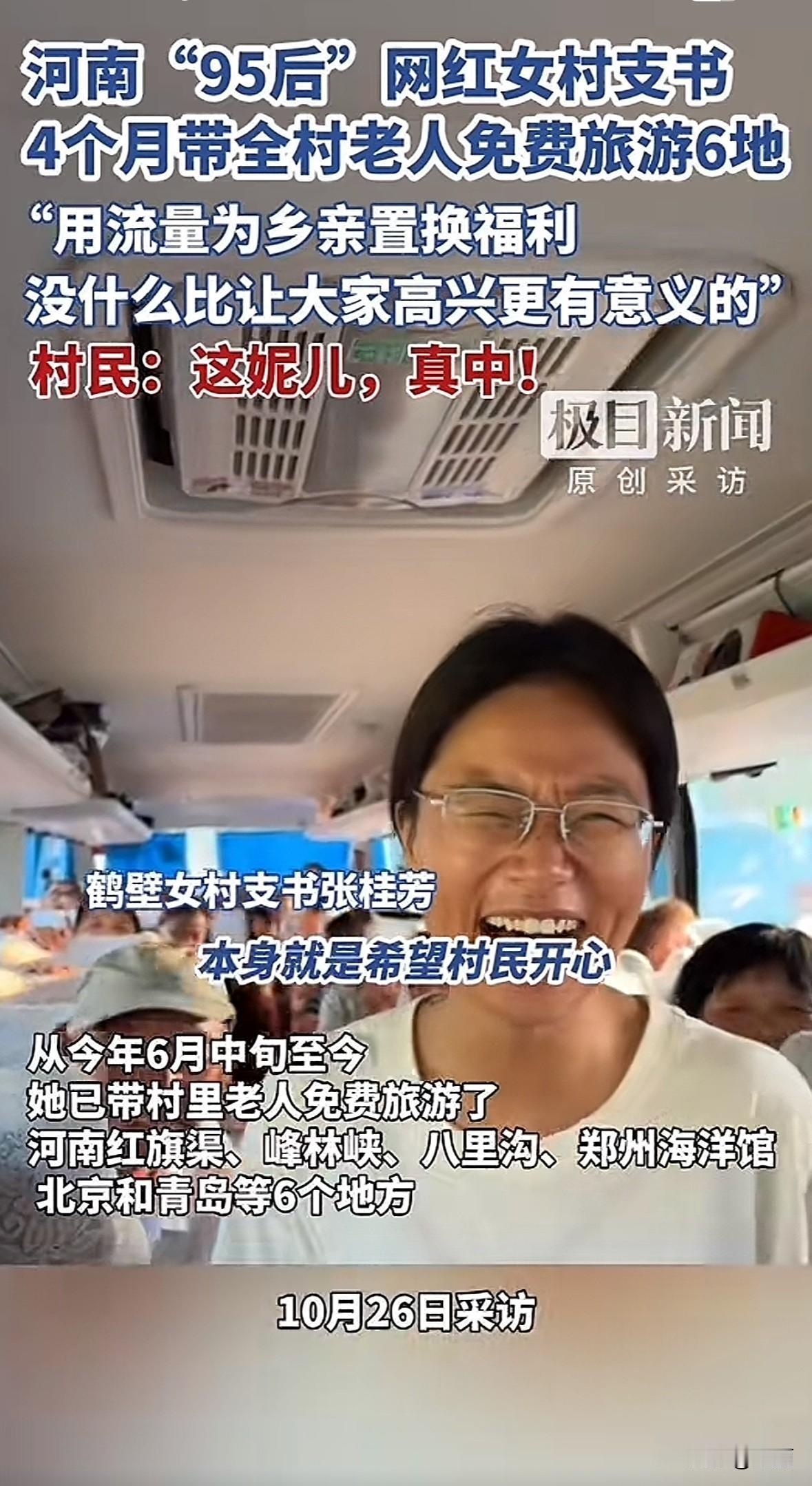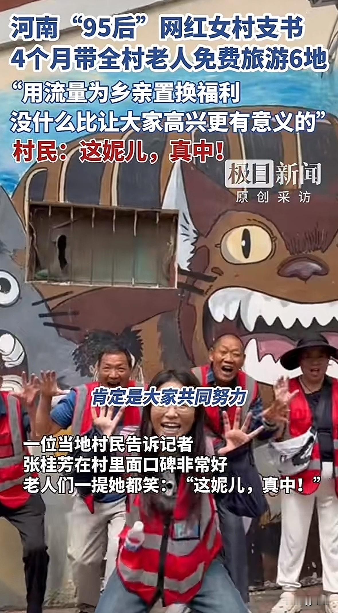 河南95后村支书张桂芳把留守村盘活了。2021年她回村当支书,先画彩绘墙造“彩虹村”引游客,2023年开抖音号“97村长小芳”,现在快50万粉了。 今年她带全村老人免费旅游,视频点赞近30万,真就兑现承诺带100位老人去了北京。还用直播收入开了老年食堂,70岁以上老人能免费吃饭,还让老人出镜带货,帮村民卖了不少土特产。 有人说她作秀,可账号收益归村集体,村里泥路变柏油路,还建了图书馆、电影院。这哪是作秀?是年轻人懂流量更懂乡亲。 现在不少年轻人回村取经,证明乡村不是退路是舞台。这种脚下有泥、眼里有光的实干,才是乡村振兴的真路子。