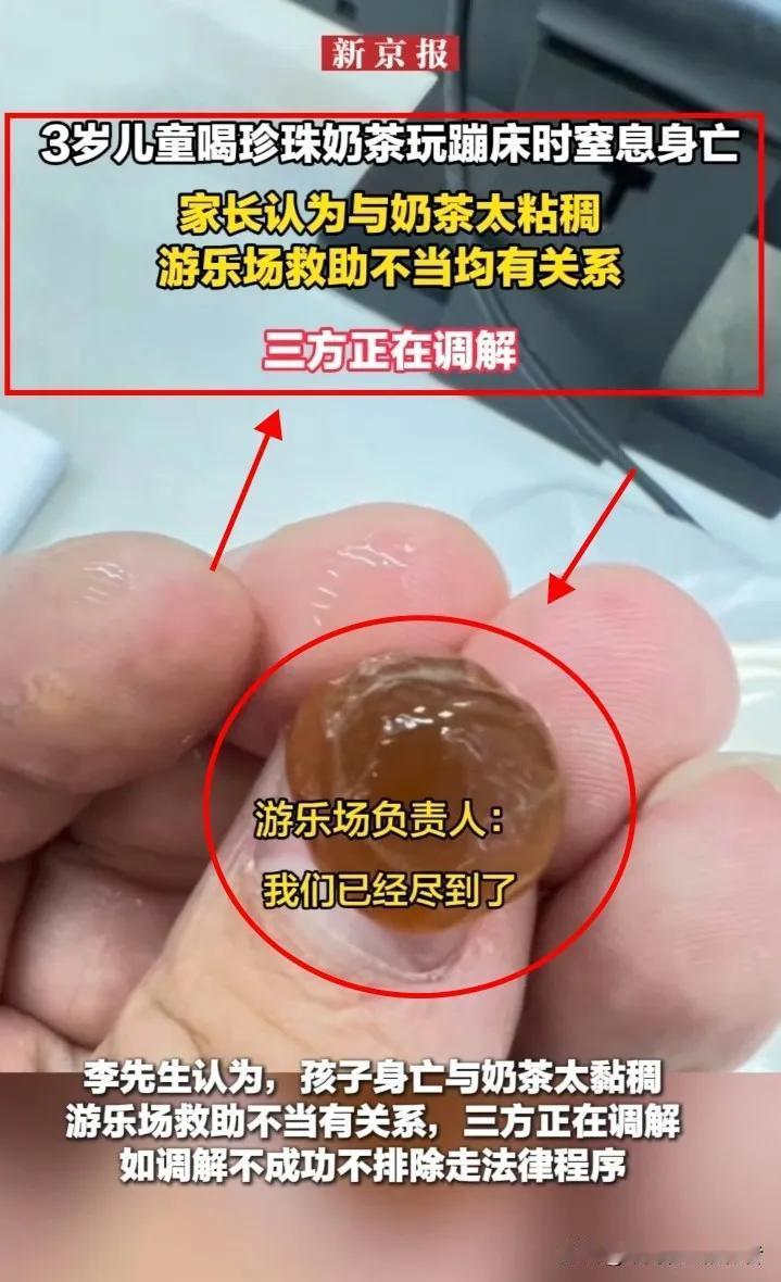 台州3岁男童噎死后续:父亲称会通过法律途径解决这件事情。 3岁男童玩耍时口渴,喝了家长买的珍珠奶茶后继续蹦床,半分钟后,剧烈运动使珍珠奶茶反涌堵住气管窒息,最终也没抢救回来。 伤心的家属去到奶茶店索要说法,说他们的珍珠奶茶有问题喝死了人,珍珠颗粒超标,为什么不提醒小孩不能喝?并指责游乐场未制止带食物入场,救助不及时,质疑商场缺乏完善的应急预案。 奶茶店称下单小程序有“儿童和老人需在看护下食用”的提示,游乐场负责人则表示已尽到救助责任… 有网友说:家属责任70%,游乐园没有人懂急救30%,奶茶店无责,除非没有提醒,标签提醒也是提醒。 关键在奶茶店没直接卖给小孩,而是家长点单购买珍珠奶茶,身为监护人的父母把珍珠奶茶拿给3岁小孩喝,这才是小孩死因关键要点。 不给幼儿喝珍珠奶茶不是常识吗?更何况才3岁。如果死者家属能把这个官司打赢,那就太让人绝望了! 也有网友表示:果冻,珍珠奶茶,都是商家为了利润设计的产品,根本不考虑它潜在的危险性!确实不合理,珍珠大吸管又有点小,有时候吸不动猛地一吸最容易卡到喉咙了… 还有网友发问:我就想知道,如果当场有人好心施救,但还是没救过来,是不是这个好心人也会成为被告?施救无方导致孩子死亡? 大家怎么看呢?