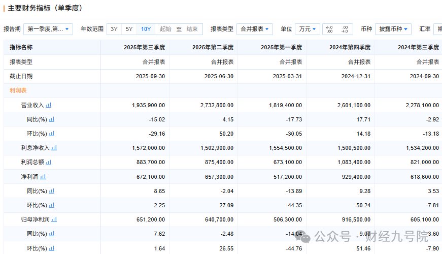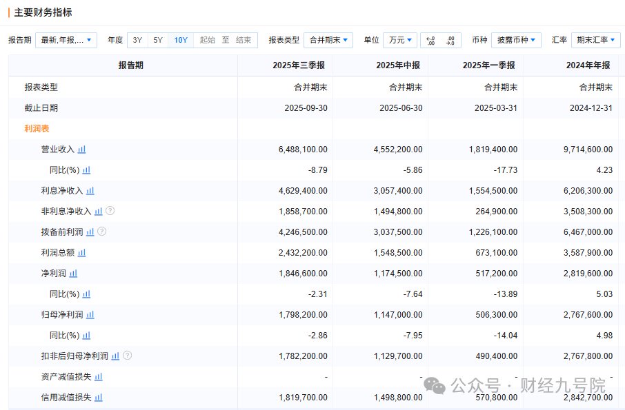 综合来看,作为杨书剑董事长上任后的首份三季报,本次财报展现出的修复态势值得肯定,但营收承压、非息业务薄弱等挑战仍需应对。与2024年同期相比,营收增速由正转负反映出收入结构的脆弱性,手续费及佣金收入等核心非息业务尚未形成稳定增长极;拨备覆盖率的持续下降虽短期释放利润,但也对风险抵御能力提出更高要求。