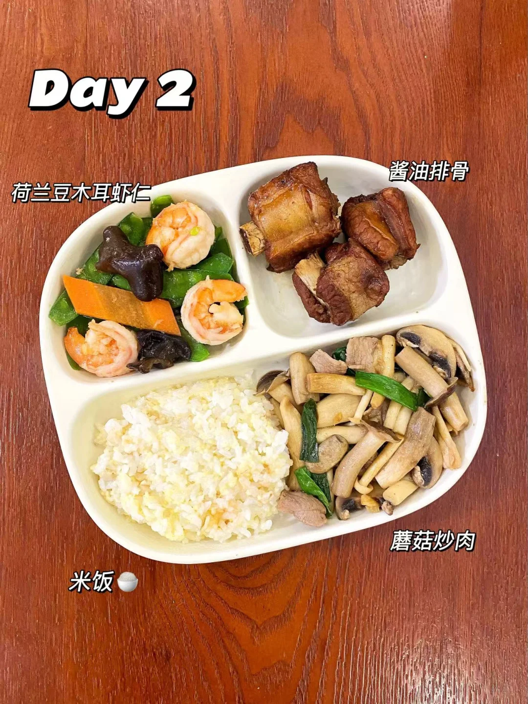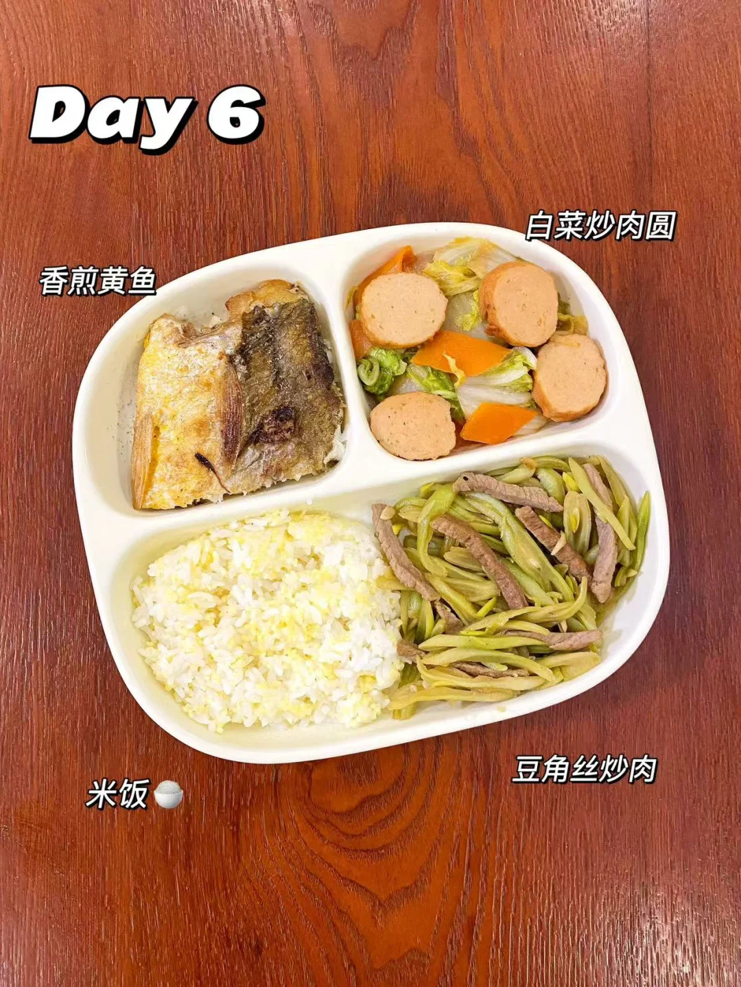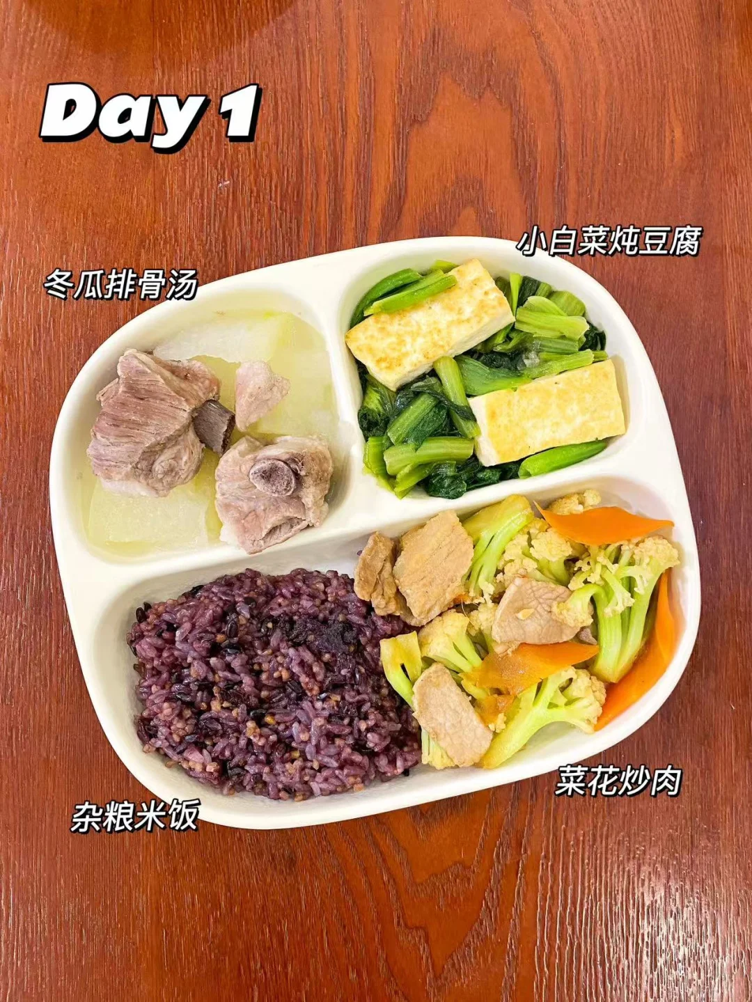 DAY11️⃣ 小白菜炖豆腐➕冬瓜排骨汤➕菜花炒肉➕杂粮米饭 DAY22️⃣ 荷兰豆木耳虾仁➕酱油排骨➕蘑菇炒肉➕米饭 DAY33️⃣ 唐扬鸡块➕芹菜炒香干➕番茄炒蛋➕杂粮米饭 DAY44️⃣ 咖喱土豆鸡肉➕萝卜丝虾汤➕米饭 DAY55️⃣ 蒜泥茼蒿➕卤鸡腿千张➕白菜炒虾➕杂粮米饭 DAY6️⃣ 香煎黄鱼➕白菜炒肉圆➕豆角丝炒肉➕米饭