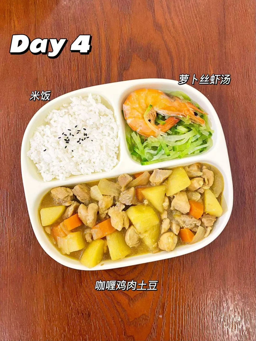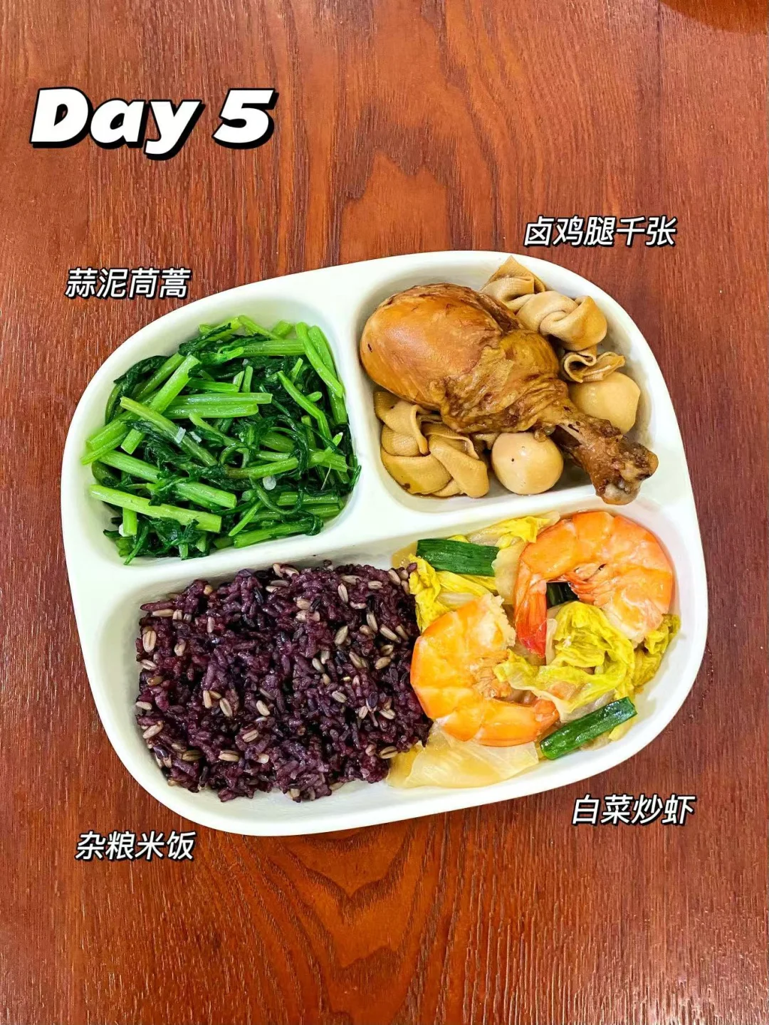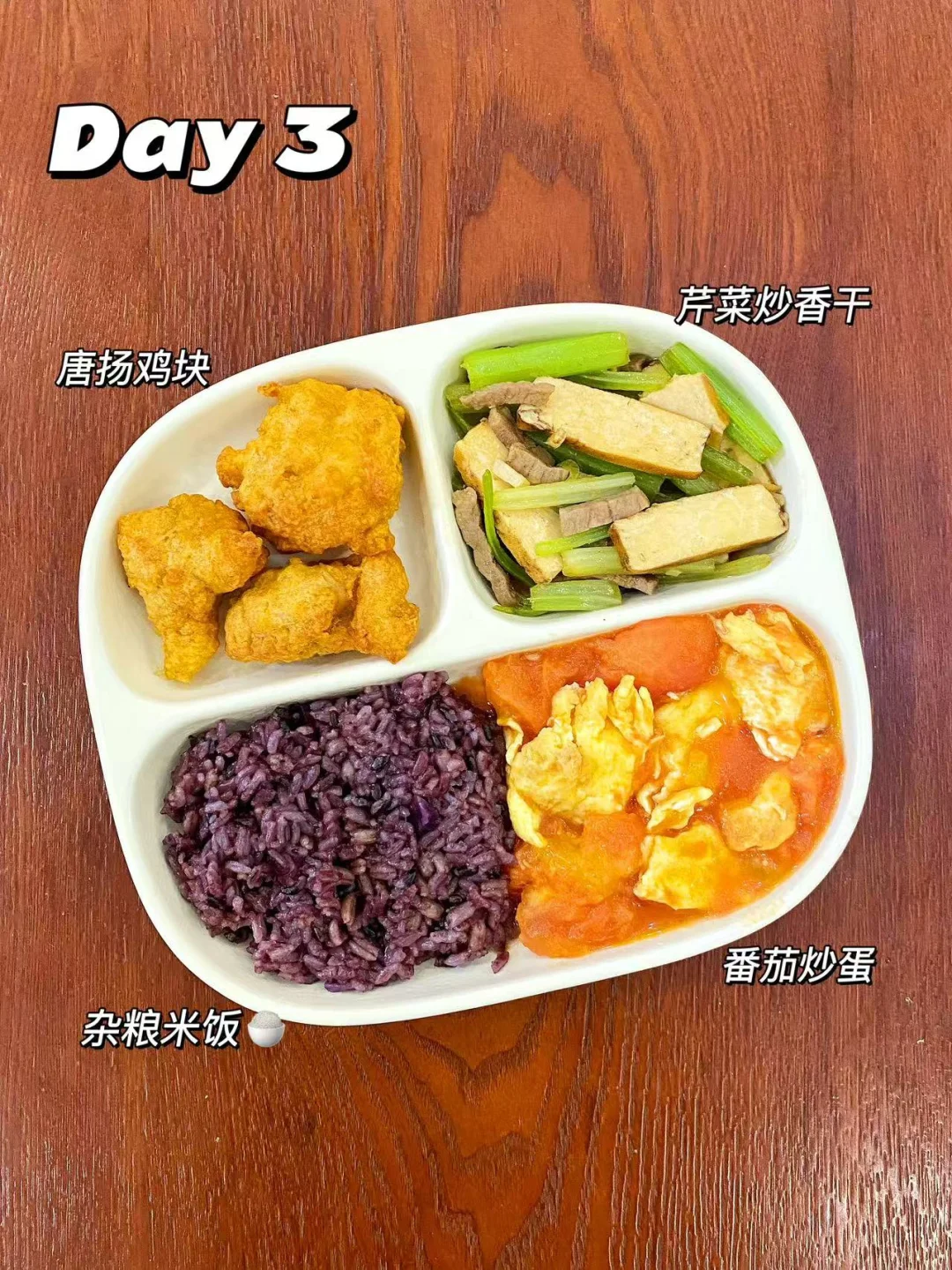 DAY11️⃣ 小白菜炖豆腐➕冬瓜排骨汤➕菜花炒肉➕杂粮米饭 DAY22️⃣ 荷兰豆木耳虾仁➕酱油排骨➕蘑菇炒肉➕米饭 DAY33️⃣ 唐扬鸡块➕芹菜炒香干➕番茄炒蛋➕杂粮米饭 DAY44️⃣ 咖喱土豆鸡肉➕萝卜丝虾汤➕米饭 DAY55️⃣ 蒜泥茼蒿➕卤鸡腿千张➕白菜炒虾➕杂粮米饭 DAY6️⃣ 香煎黄鱼➕白菜炒肉圆➕豆角丝炒肉➕米饭