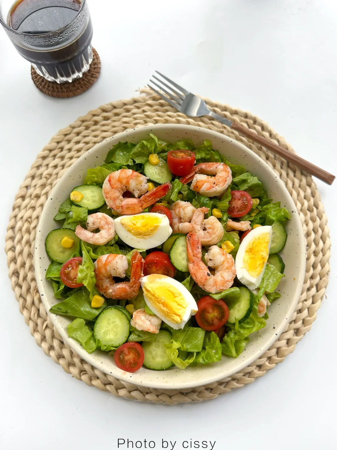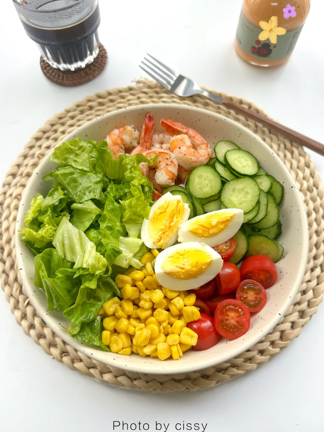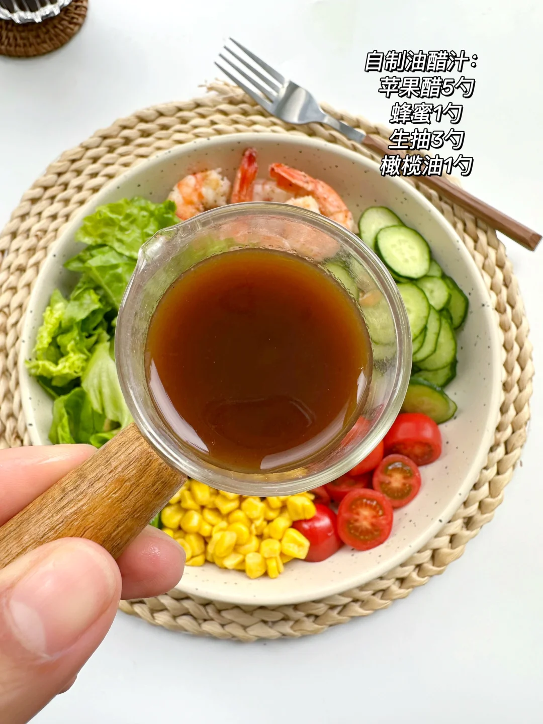 ☀️今天中午安排了满满一大盘蔬菜沙拉,让肠胃轻松一下。 ~ 🥗食材:虾仁、鸡蛋、小黄瓜、小番茄、生菜、玉米粒 做法: 1️⃣所有蔬菜洗净切块,鸡蛋和虾仁玉米粒煮熟 。 2️⃣全部蔬菜放入容器中,淋入沙拉酱或油醋 ~ 自制调个油醋汁:苹果醋5勺+橄榄油1勺+蜂蜜1勺 十生抽3勺十黑胡椒碎适量。 ~ 🥗健康、解馋又饱腹呀‼️春暖花开,快点安排起来~