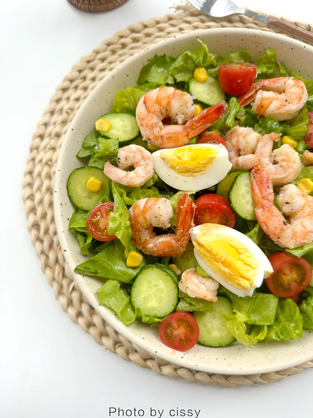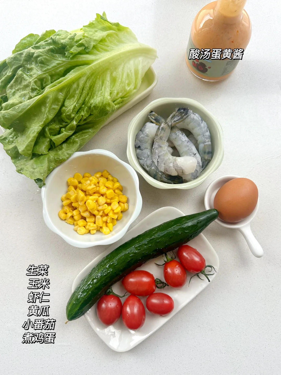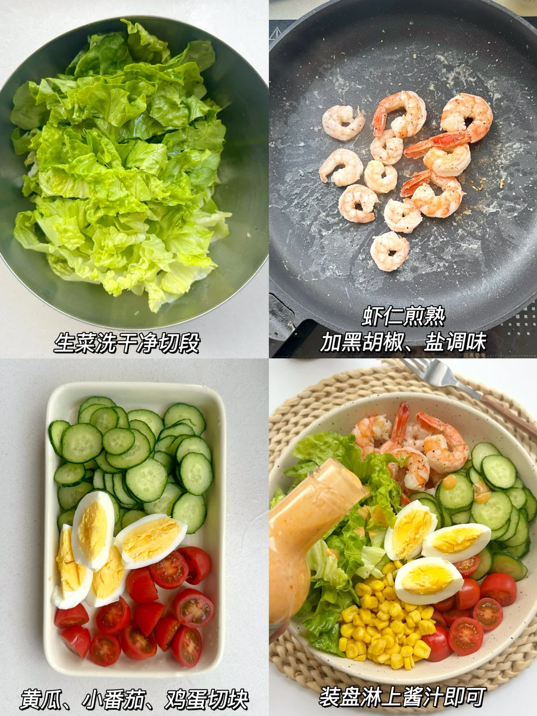 ☀️今天中午安排了满满一大盘蔬菜沙拉,让肠胃轻松一下。 ~ 🥗食材:虾仁、鸡蛋、小黄瓜、小番茄、生菜、玉米粒 做法: 1️⃣所有蔬菜洗净切块,鸡蛋和虾仁玉米粒煮熟 。 2️⃣全部蔬菜放入容器中,淋入沙拉酱或油醋 ~ 自制调个油醋汁:苹果醋5勺+橄榄油1勺+蜂蜜1勺 十生抽3勺十黑胡椒碎适量。 ~ 🥗健康、解馋又饱腹呀‼️春暖花开,快点安排起来~