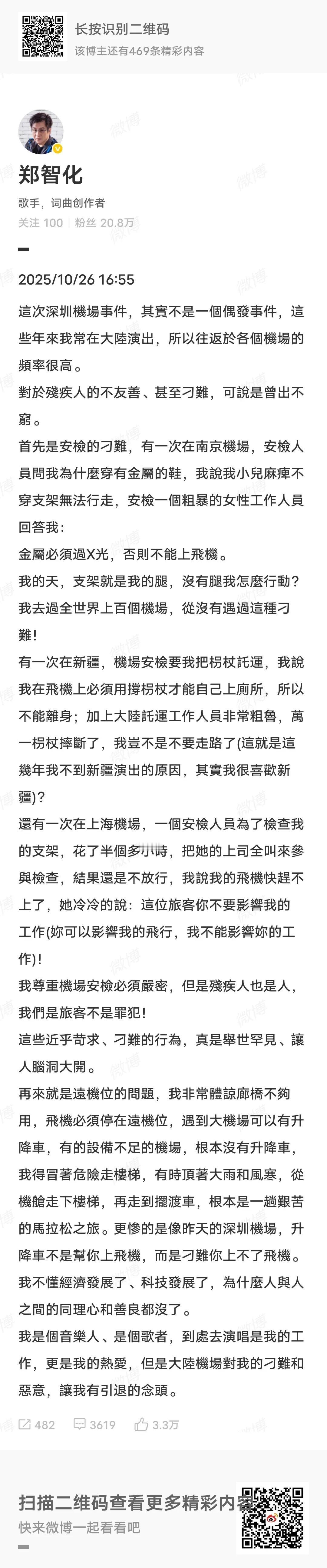 郑智化机场事件反转!监控曝光,网友怒了:别再消费善良了! 深圳机场这事儿,终于真相大白了!咱们先说清楚,不造谣不传谣,只讲监控拍到的事实。 歌手郑智化前两天发微博,说自己在深圳机场坐轮椅登机,升降车和机舱门有25公分高差,工作人员“冷眼旁观”,他只能“连滚带爬”进飞机,语气那叫一个心酸,不少人都心疼坏了,纷纷骂机场没人情味。 可就在昨晚,深圳机场发通报+监控视频,把全过程清清楚楚摆了出来——事实根本不是他说的那样! 因为航班停在远机位,机场专门安排了登机车接送。由于飞机在装卸时会有晃动,为防止设备刮碰,安全规范要求登机车和舱门保持20公分高度差,这是行业通则,不是针对他一个人。最终,在航空公司和机组人员的协助下,他安全、平稳地进入了客舱,全程有两人贴身帮扶。 也就是说,他确实遇到了技术上的不便,但没有被冷眼旁观,更没有“连滚带爬”。机场当晚就道歉,并立刻整改:以后有轮椅旅客的航班,优先安排廊桥;保障人员从1人增到2人;还要试点带坡度的连接装置,解决高度差问题。 说实话,机场的服务确实有改进空间,无障碍设施和流程还得再优化。但郑智化把“客观困难”说成“人为冷漠”,把“协助登机”说成“连滚带爬”,这就有点过了。 我们理解他作为残障人士出行不易,也支持他提出合理诉求。但不能为了博同情,夸大事实,把一线工作人员的辛苦付出说得那么不堪吧? 网友说得对:我们可以体谅难处,但不能接受“卖惨式”指控。机场已经积极整改,这事就到此为止吧。希望以后所有特殊旅客都能被温柔以待,也希望每一次发声,都对得起公众的善良。