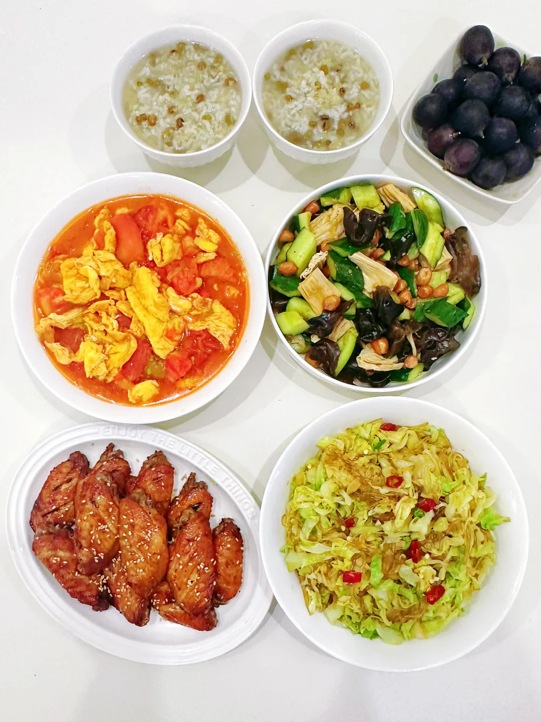 🌈今天吃: 🍗蜜汁烤翅 🥬包菜炒粉 🍅番茄炒蛋 🥒黄瓜木耳拌腐竹 ~ 🍗今天的蜜汁烤翅太好吃啦,小朋友吃得停不下来,无抗鸡翅,孩子也可以放心吃哦❤️。