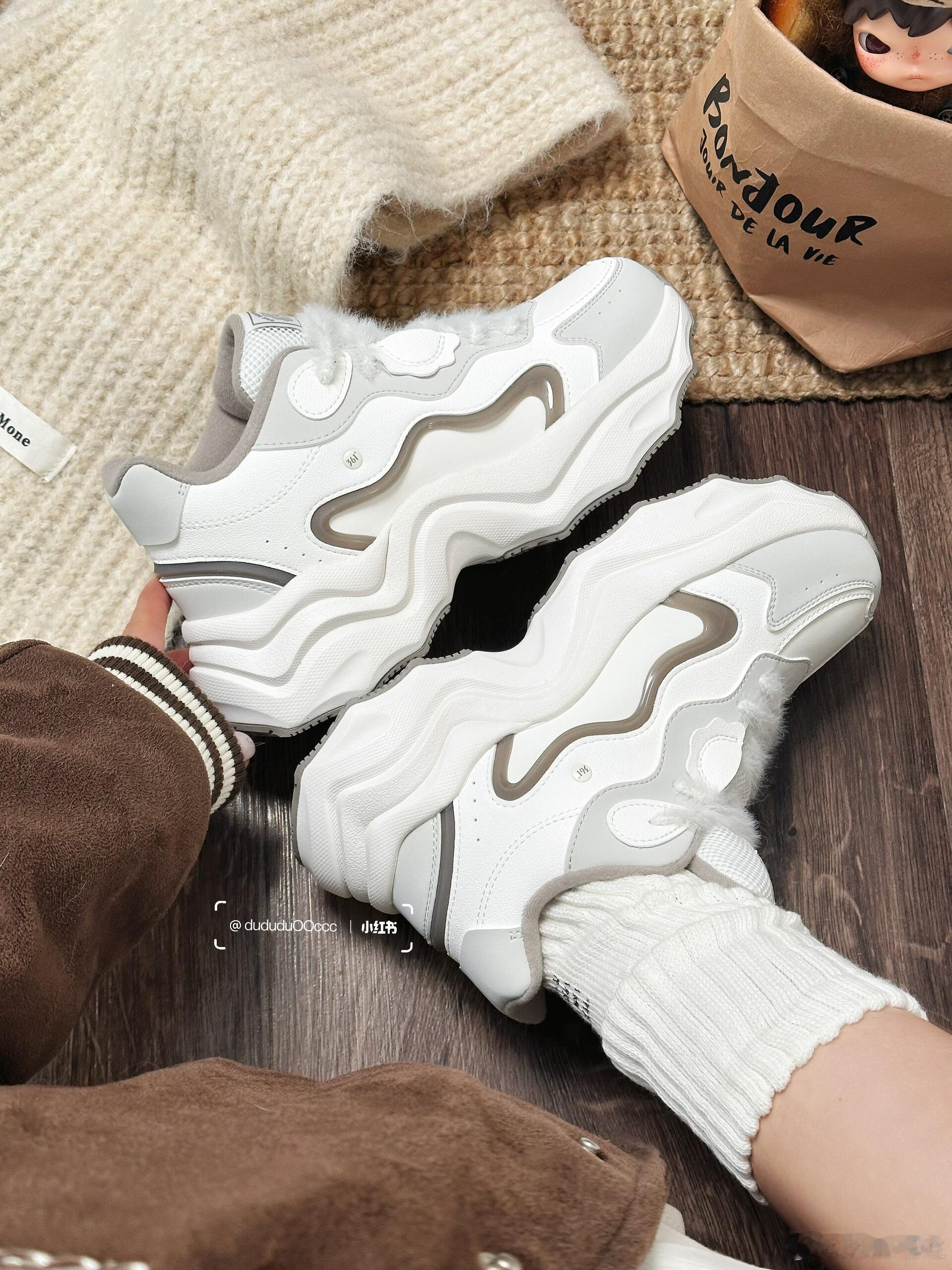 这双白色厚底运动鞋以极简设计展现时尚感,鞋面采用透气网布与合成革拼接,灰色线条勾勒出流畅轮廓。最具巧思的是鞋带处悬挂的白色小生物吊饰,圆润造型与黑色小眼睛瞬间为整体注入灵动趣味。搭配蓬松的白色堆堆袜,完美呼应鞋舌与内衬的毛绒细节,营造出温暖柔软的秋冬氛围。厚底设计在视觉上延长腿部线条,兼具舒适性与潮流感。无论是日常出行或休闲穿搭,都能成为点亮造型的俏皮单品。时尚鞋履时尚奢品