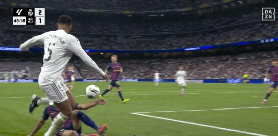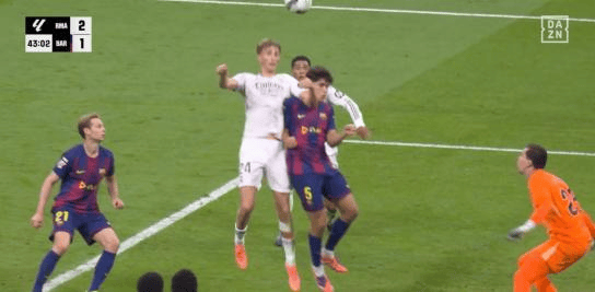 这是本场比赛裁判最难判断的一次判罚。在埃里克-加西亚与贝林厄姆的对抗中,球击中了后者的手臂,索托-格拉多没有判罚点球。皮球反弹,因此裁判认为不应判罚。