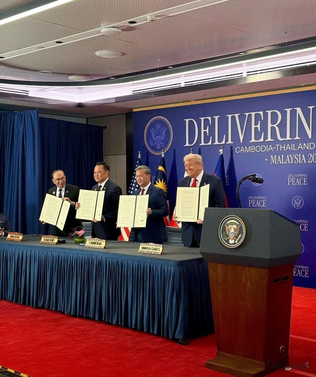 泰国.柬埔寨在马来西亚吉隆坡签署了和平协议,特朗普也到场抢镜。看特朗普大嘴一咧笑的!