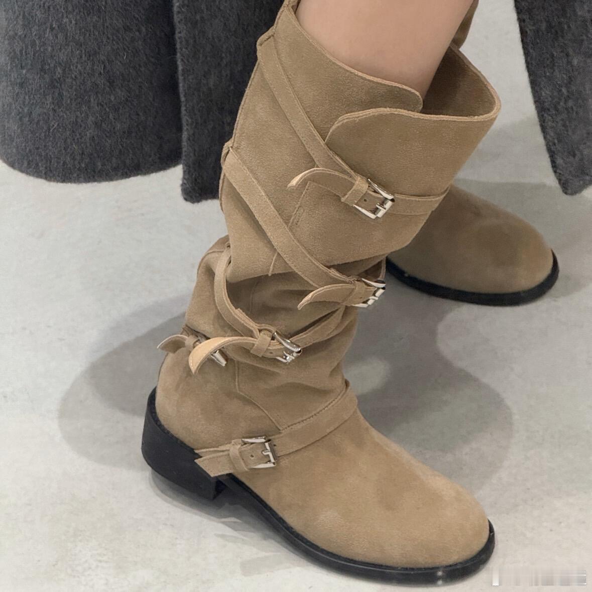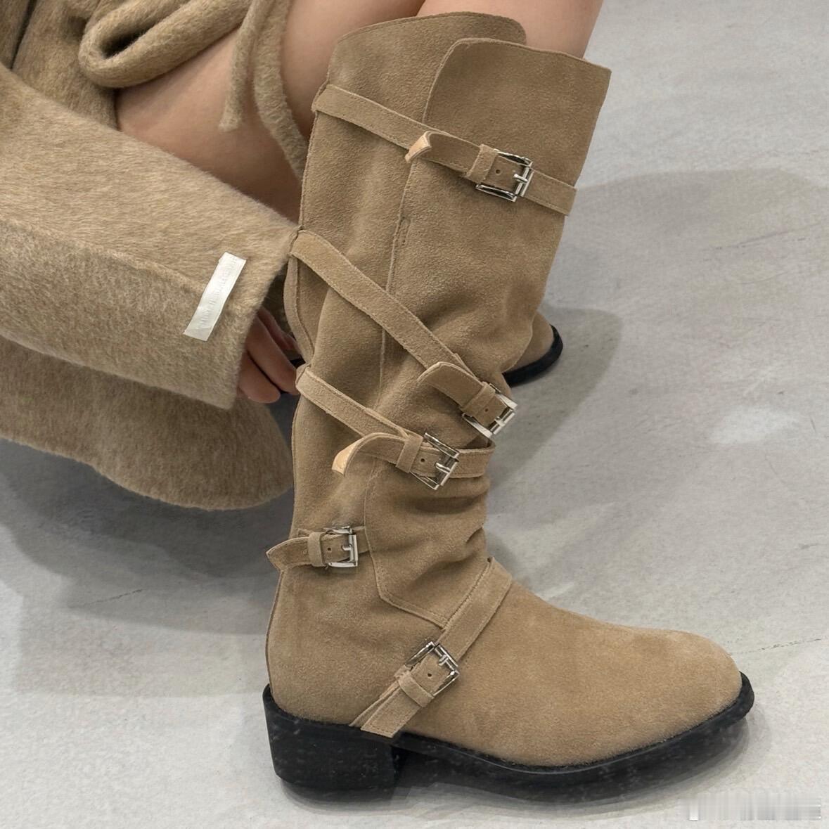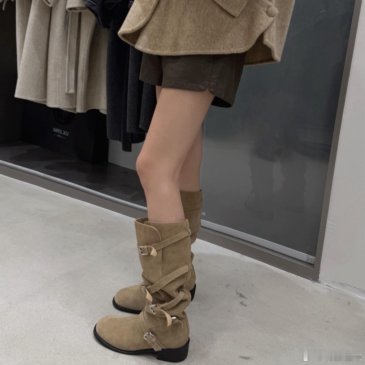 这是一双设计感十足的米色麂皮长筒靴。其最大的亮点在于靴筒侧边的多条平行皮质绑带,每一条都配有闪亮的银色金属扣环,营造出强烈的酷感与复古机车风。圆润的鞋头与稳健的粗跟设计,搭配深色鞋底,既保证了舒适度又增添了稳重感。细腻的麂皮材质和精致的金属细节相得益彰,使这双靴子成为兼具个性与质感的时尚单品,非常适合打造帅气又时髦的秋冬造型。时尚鞋履时尚奢品