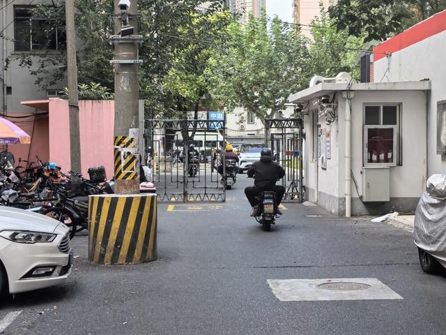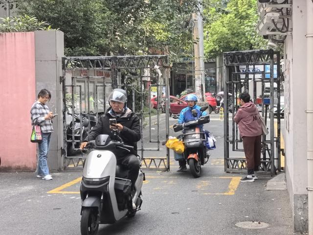上午10时刚过,南泉北路上的一处骑手驿站里,骑手们正坐着刷手机,等到点餐高峰的到来,但南侧不远处的通道内,险象苗头已然显现:通道西端南泉北路1040弄入口比邻东昌中学南校大门口,空间狭窄,出于安全考虑,这里仅作为行人和非机动车的进出口,4折的铁门也只打开了中间宽不足1米的一扇,仅供单人或单车通过。只见已零零星星有骑手骑着电动自行车从南泉北路上飞快地拐入1040弄小区入口外侧的通道,穿过用于阻拦机动车的路障,再“精准”地穿过狭窄的铁门,进入小区通道。进进出出的小区居民并不会令他们减速,回应的只有急促刺耳的喇叭声。只有遇到刚好有外卖车辆从通道内驶出时,两辆车才会在铁门口“角力”一下,先抵达的获得通过权,后到的只得刹停让一让。