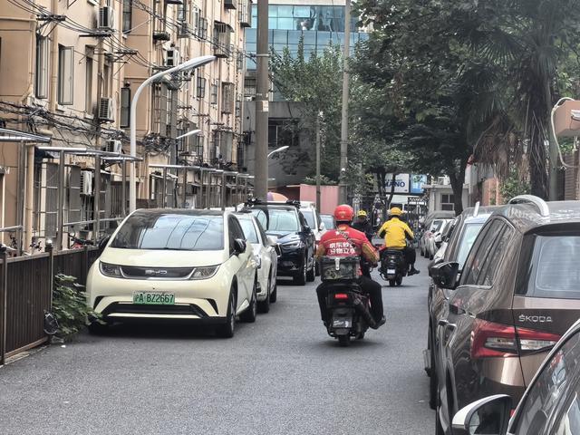 狭窄的通道内,外卖电动自行车们在两侧停放的车辆和人流间穿梭。